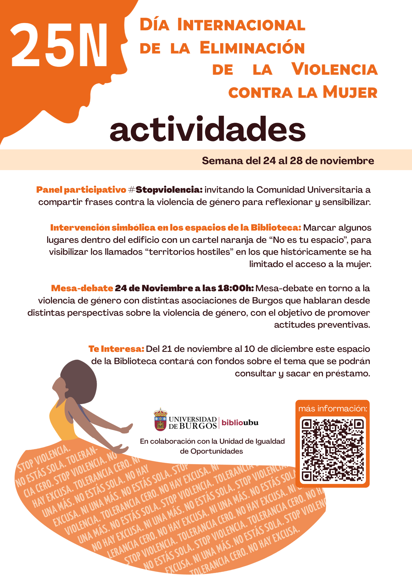Con motivo del 25N, Día Internacional de la Eliminación de la Violencia contra la Mujer, la Biblioteca Universitaria Federico Sanz organiza, del 24 al 28 de noviembre, una serie de actividades destinadas a promover la reflexión, la sensibilización y el compromiso frente a la violencia contra la mujer. Estas actividades incluyen un panel participativo, una intervención en los espacios de la Biblioteca y una mesa-debate con asociaciones de Burgos para abordar la violencia de género desde diferentes perspectivas. Además, el espacio “Te Interesa” pondrá a disposición de los usuarios fondos relacionados con esta temática.