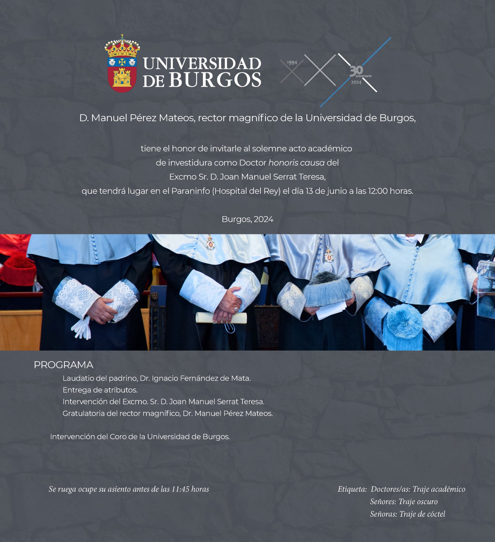 Durante la ceremonia intervendrá el Coro de la Universidad de Burgos. Tras el acto, el nuevo doctor descubrirá el vitor con su nombre en el Patio de Romeros y visitará el Jardín de la Sabiduría.