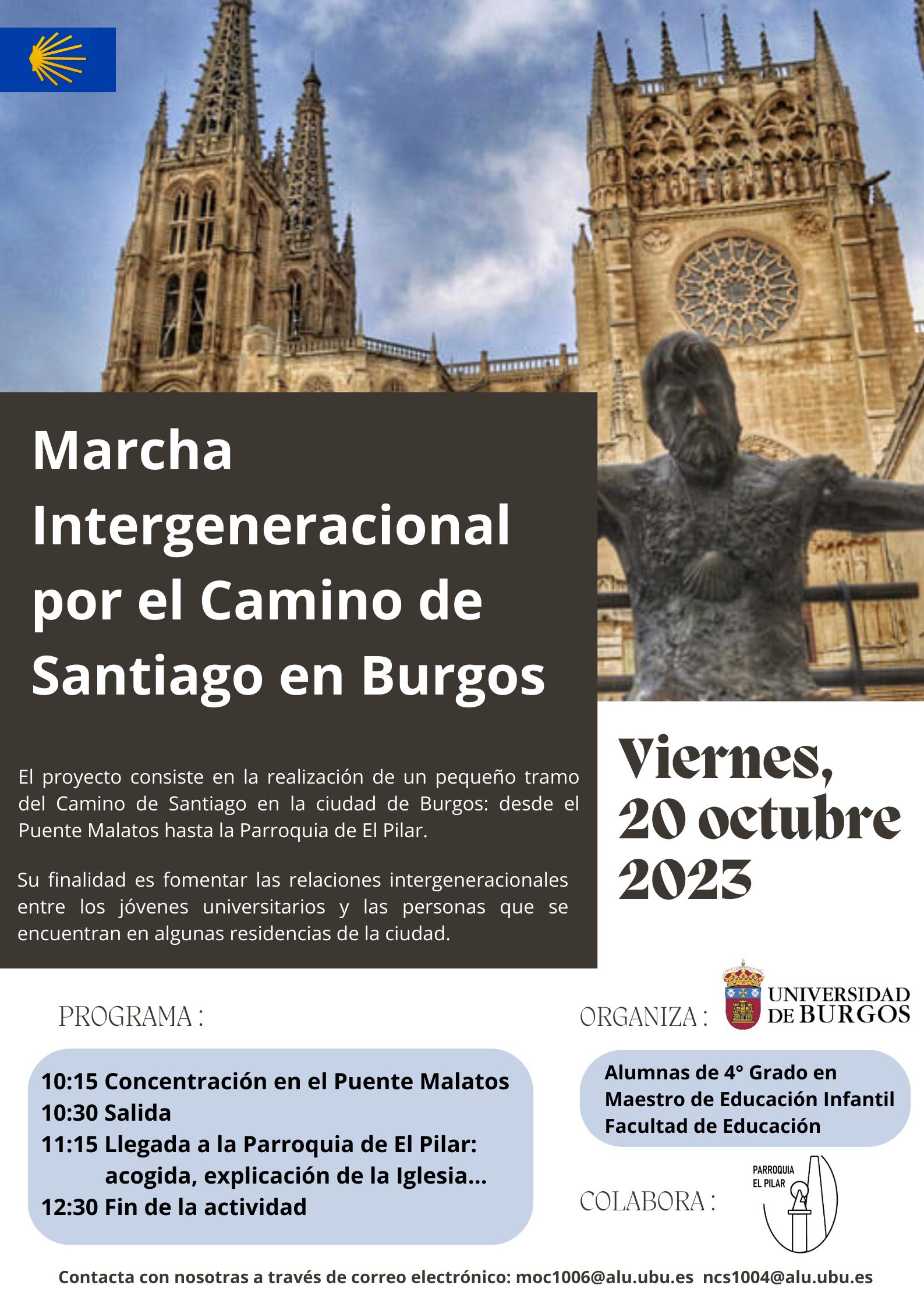 Alumnos del 4º curso del Grado se pusieron en contacto con algunas residencias de personas mayores de la ciudad para invitar a los residentes a participar en esta marcha, que partirá desde el Puente Malatos y concluirá en la parroquia de El Pilar con un sencillo encuentro donde se compartirá la experiencia del camino. El acto concluirá con un sencillo aperitivo.