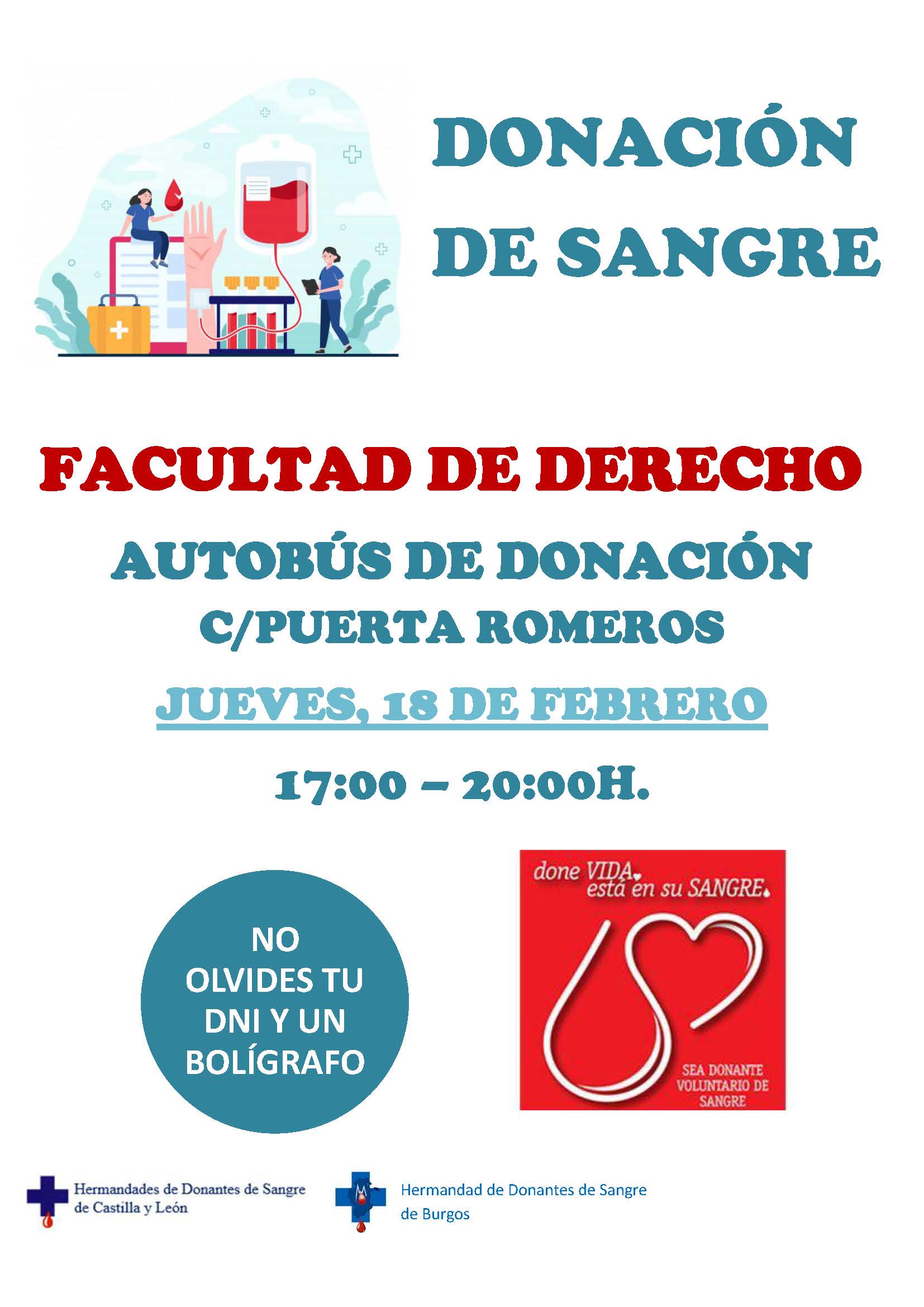 La Hermandad de Donantes de Sangre, el Centro de Hemodonación y la Universidad de Burgos organizan una campaña de donación de sangre en la Facultad de Derecho. El autobús donde se realizan las donaciones permanecerá en la Facultad de Derecho, en la Puerta Romeros, en horario de 17:00-20:00h