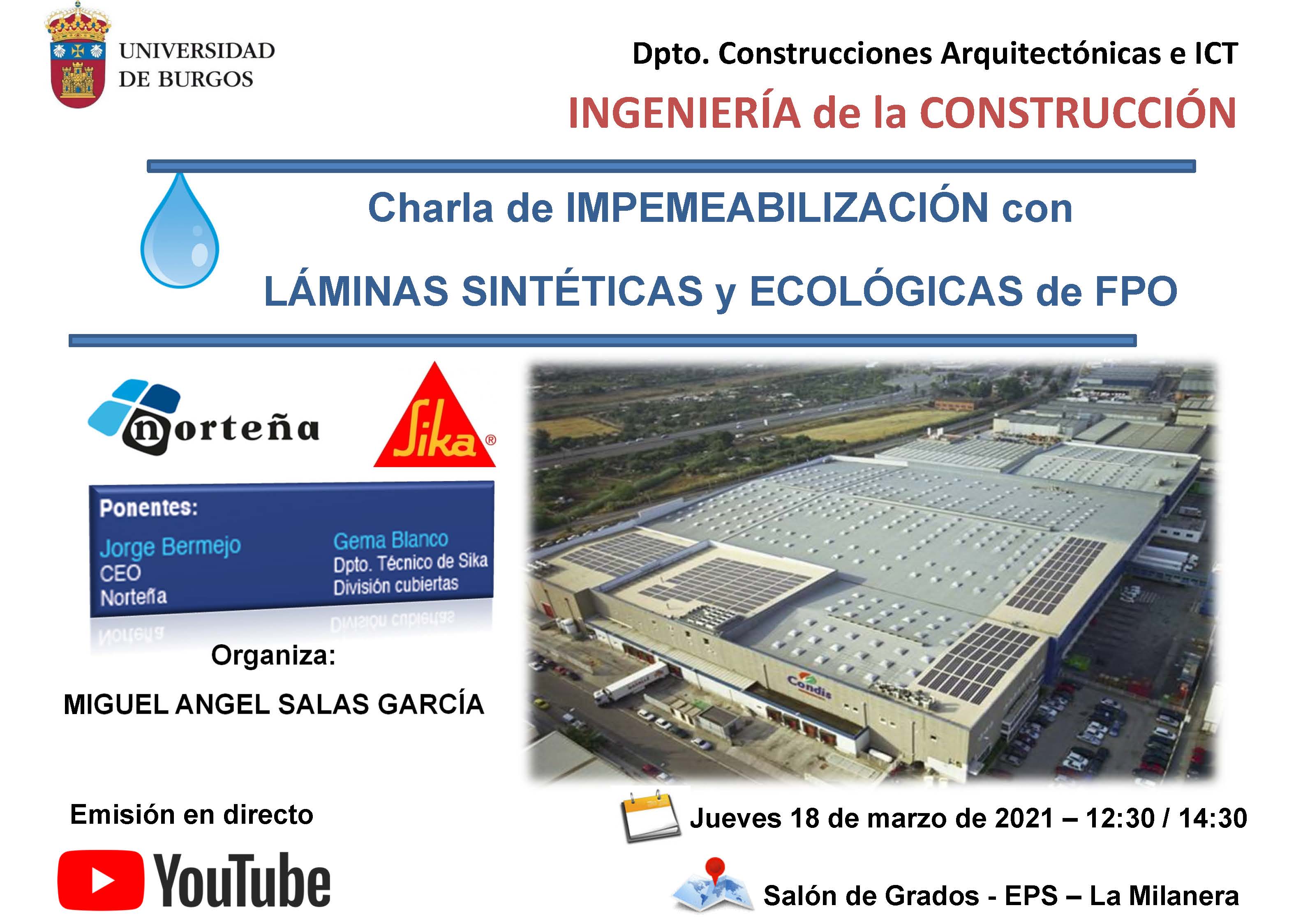 El Departamento de Construcciones Arquitectónicas e ICT organiza la charla “Impermeabilización con láminas sintéticas y ecológicas de FPO”. La formación estará a cargo de Jorge Bermejo, CEO de Norteña, y Gema Blanco, del Departamento Técnico de Sika. División cubiertas.