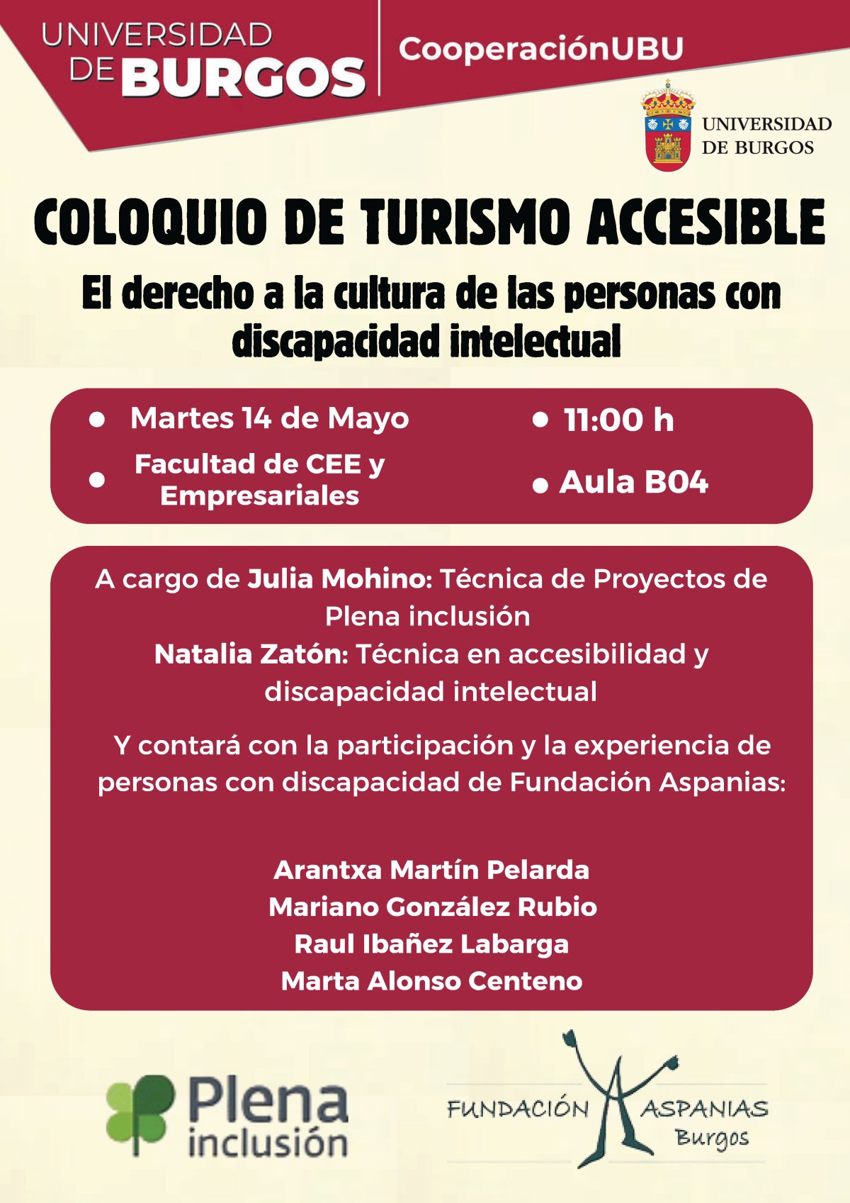 La Unidad de atención a la Diversidad de la Universidad de Burgos, el Grado en Turismo, la asociación Plena Inclusión y la Fundación Aspanias, organizan el martes 14 de mayo, a las 11:00 una charla- coloquio bajo el título "Turismo accesible: el derecho a la cultura de las personas con discapacidad intelectual". La actividad se desarrollará en el aula B04 de la Facultad de Ciencias Económicas y Empresariales.
