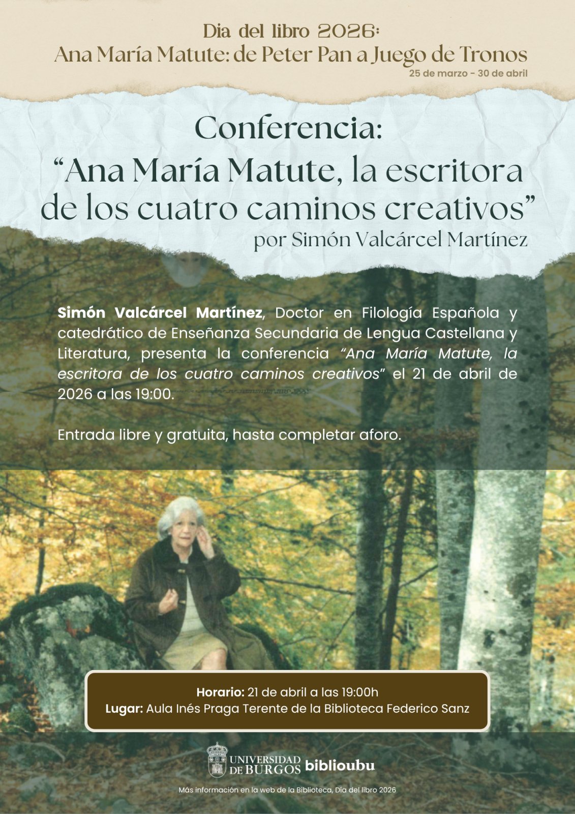 En este marco, el profesor Simón Valcárcel Martínez, doctor en Filología Española y catedrático de Enseñanza Secundaria de Lengua Castellana y Literatura, presenta la conferencia "Ana María Matute, la escritora de los cuatro caminos creativos” el martes 21 de abril de 2026 a las 19:00 en el Aula Inés Praga Terente de la Biblioteca Federico Sanz. La entrada es libre hasta completar aforo.