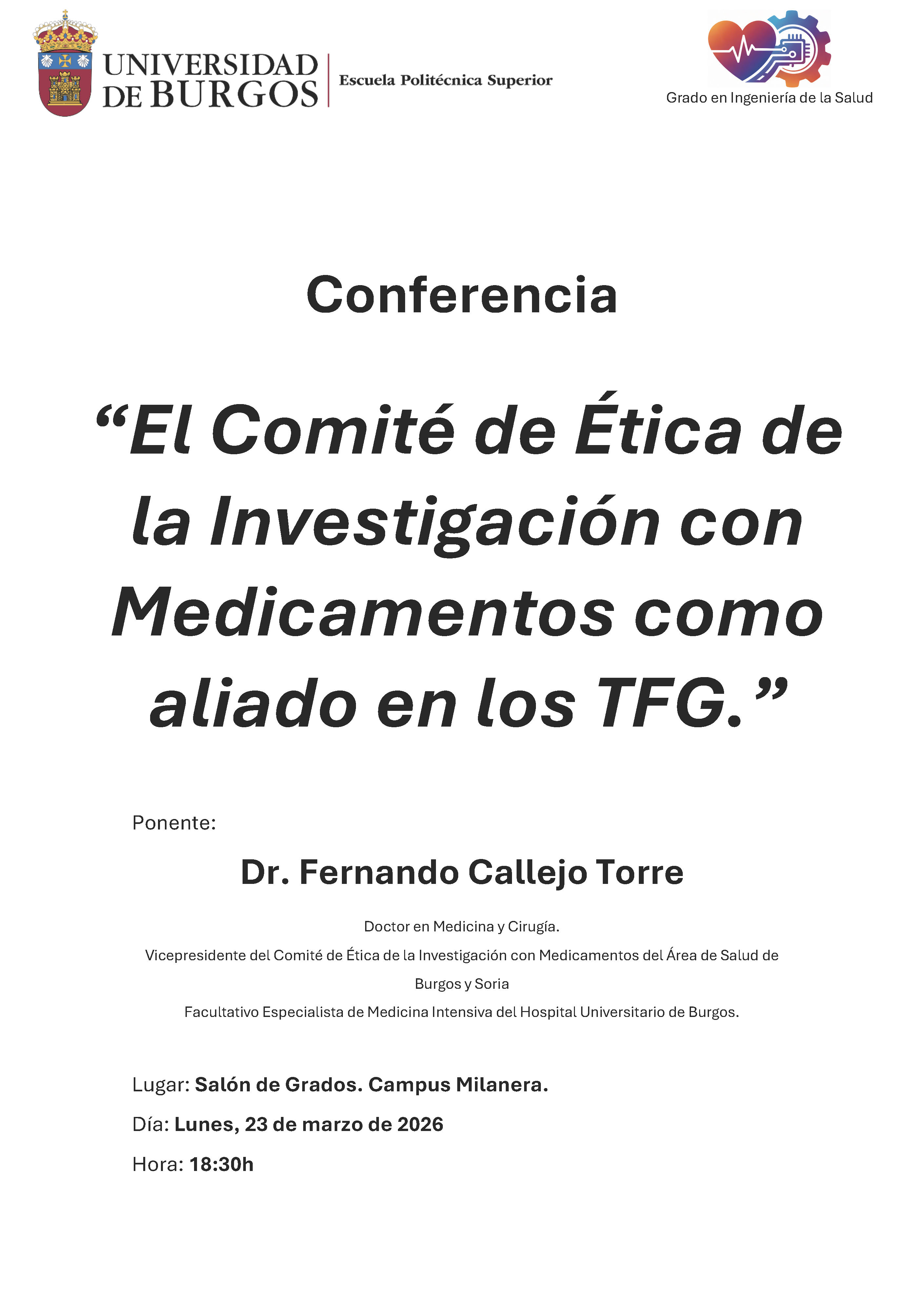 El Grado en Ingeniería de la Salud promueve la conferencia “El Comité de Ética de la investigación con Medicamentos como aliado en los TFG” el lunes 23 de marzo a las 18:30 h en el Salón de Grados de la Escuela Politécnica Superior (Milanera).