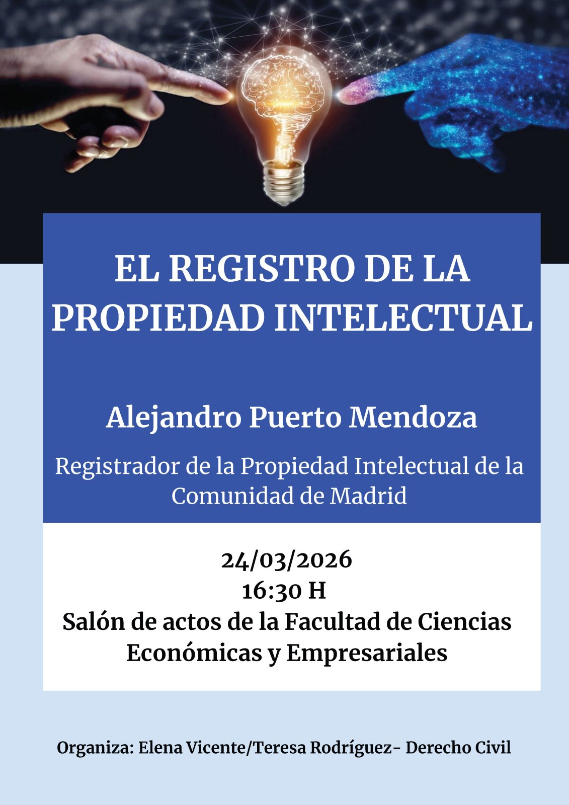 A partir de las 16.30 h, en el salón de actos de la Facultad de Ciencias Económicas y Empresariales, Alejandro Puerto Mendoza, registrador de la propiedad intelectual de la Comunidad de Madrid, abordará el funcionamiento de este servicio público administrativo como instrumento de seguridad jurídica para los creadores, su funcionamiento y los retos que afronta en el creciente entorno digital, marcado por el desarrollo de la Inteligencia Artificial.