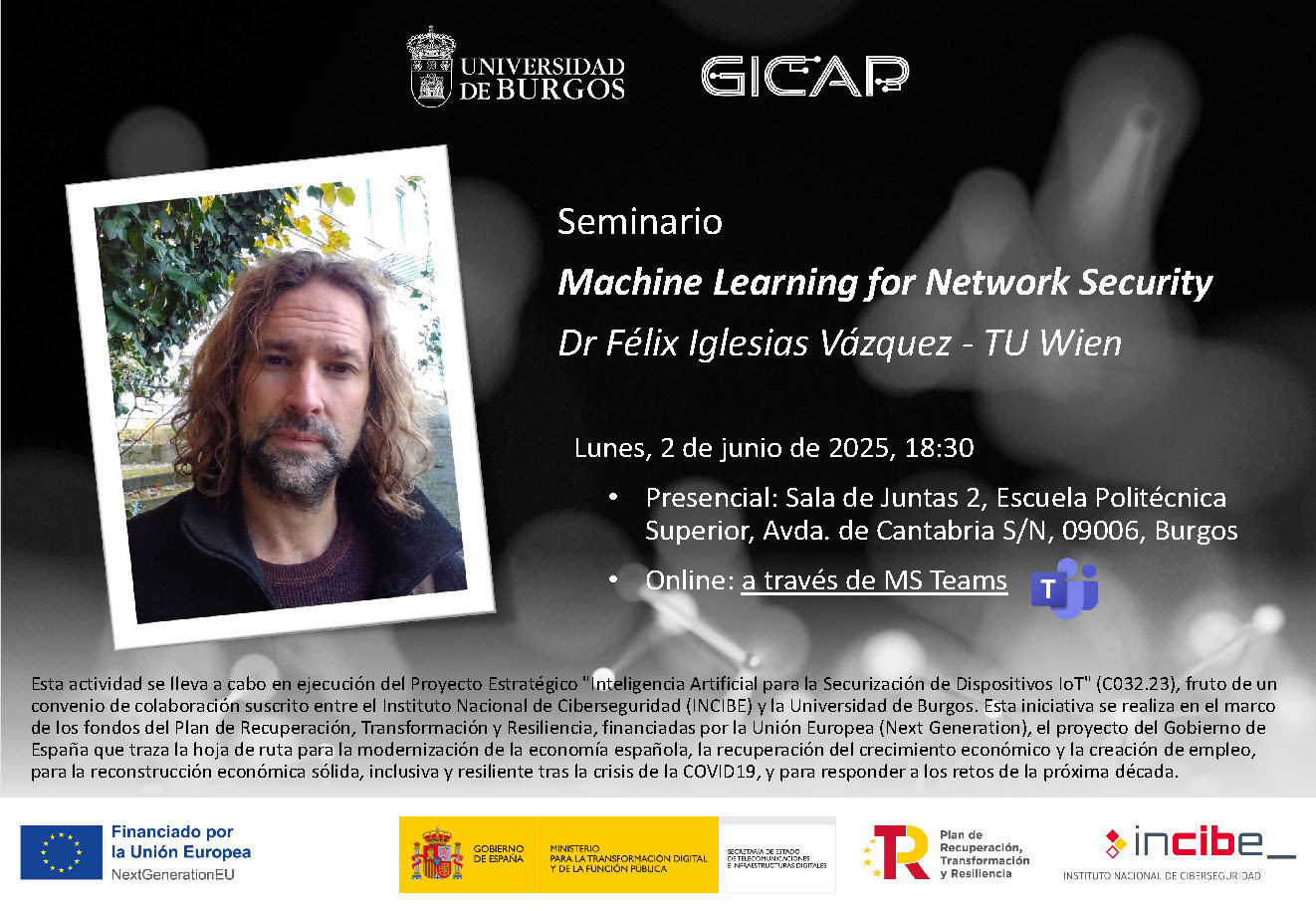 Esta actividad se lleva a cabo en ejecución del Proyecto Estratégico "Inteligencia Artificial para la Securizaciónde Dispositivos IoT" (C032.23), fruto de un convenio de colaboración suscrito entre el Instituto Nacional de Ciberseguridad (INCIBE) y la Universidad de Burgos. Esta iniciativa se realiza en el marco de los fondos del Plan de Recuperación, Transformación y Resiliencia, financiadas por la Unión Europea (Next Generation), el proyecto del Gobierno de España que traza la hoja de ruta para la modernización de la economía española, la recuperación del crecimiento económico y la creación de empleo, para la reconstrucción económica sólida, inclusiva y resiliente tras la crisis de la COVID19, y para responder a los retos de la próxima década.