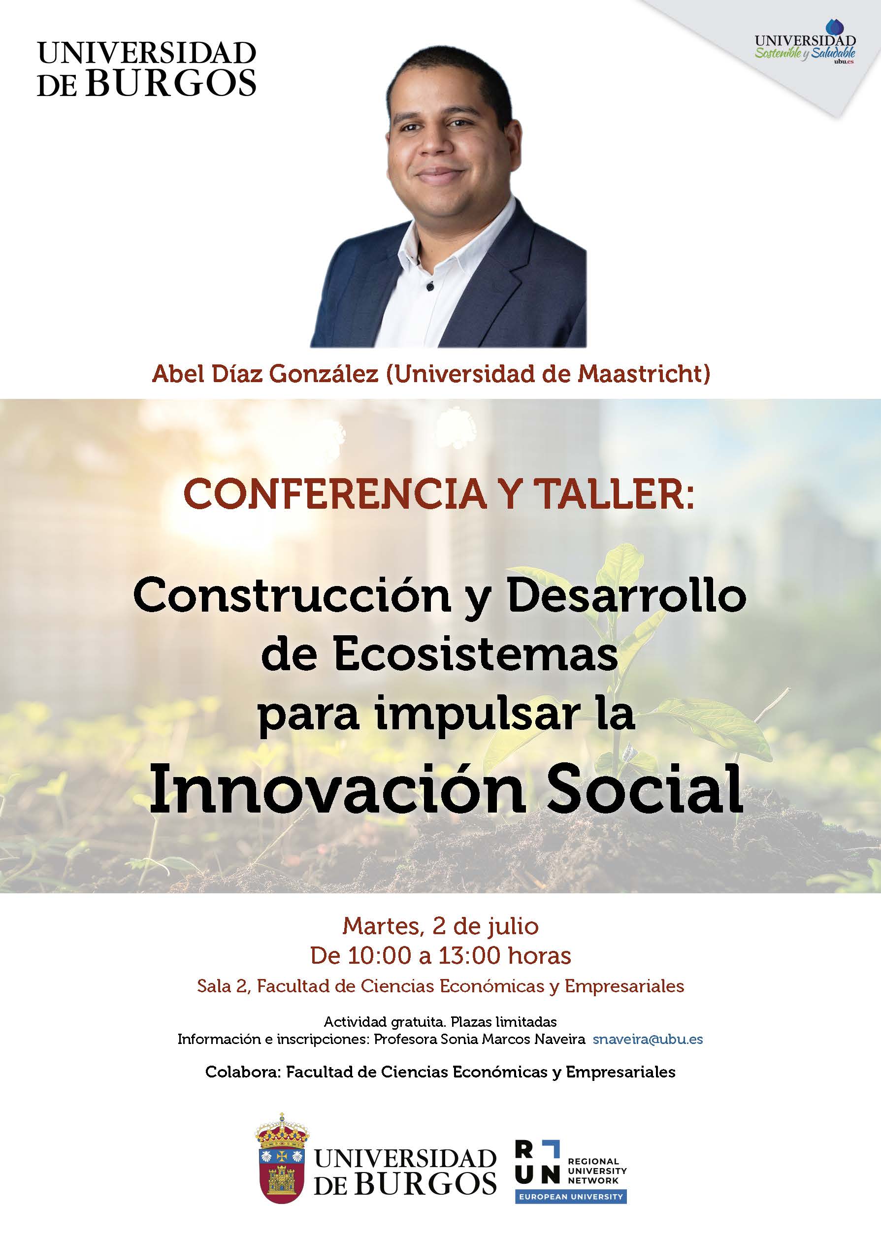 Abel Díaz González, profesor de la Universidad de Maastricht, impartirá la conferencia y el taller "Construcción y desarrollo de ecosistemas para impulsar la innovación social", el martes, 2 de julio de 2024, a las 10:00 h en la sala 2 de la Facultad de Ciencias Económicas y Empresariales de la Universidad de Burgos.