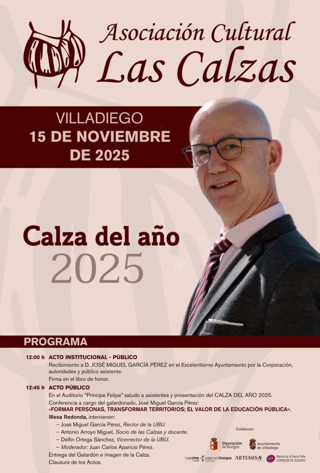 El rector de la Universidad de burgos, José Miguel García, será distinguido con la Calza del año por la Asociación Cultural Las Calzas de Villadiego en un acto que comenzará a las 12:00 h en el ayuntamiento de la localidad. Tras el recibimiento del rector por parte de la corporación municipal y la firma en el libro de honor, a las 12:45 h se celebrará el acto público integrado por una conferencia y una mesa redonda sobre el valor de la educación pública en la que participará el rector junto con Antonio Arroyo Miguel, docente y Delfín Ortega Sánchez, vicerrector de la UBU. La mesa estará moderada por Juan Carlos Aparicio Pérez. Seguidamente, tendrá lugar la entrega del galardón.