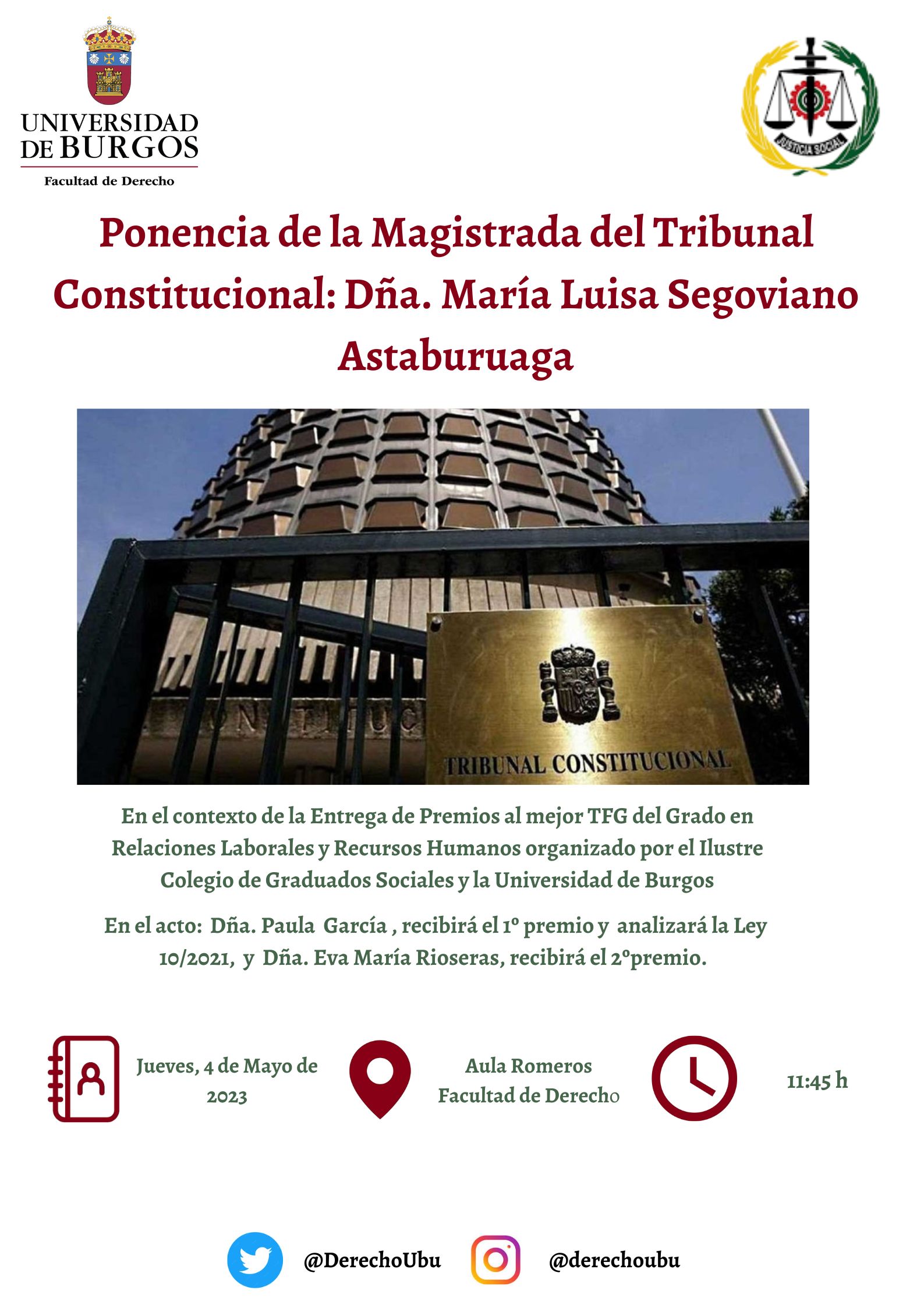 Durante el acto se hará entrega de estos premios a las estudiantes Paula García y Eva María Rioseras. Paula García, ganadora del primer premio, analizará La Ley 10/2021, de 9 de julio, de trabajo a distancia, comúnmente conocida como Ley del Teletrabajo, tema que también centrará la intervención de la magistrada María Luisa Segoviano.