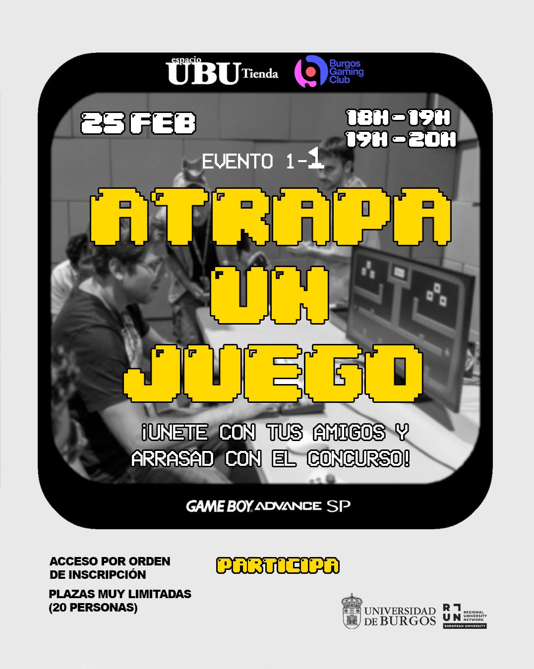 El espacio UBU Tienda celebrará el 25 de febrero su Evento 1, bajo el título “Atrapa un juego” y organizado en colaboración con la asociación universitaria Burgos Gaming Club. Entre las 18:00 y las 20:00 horas, las personas interesadas podrán participar en este torneo de videojuegos.