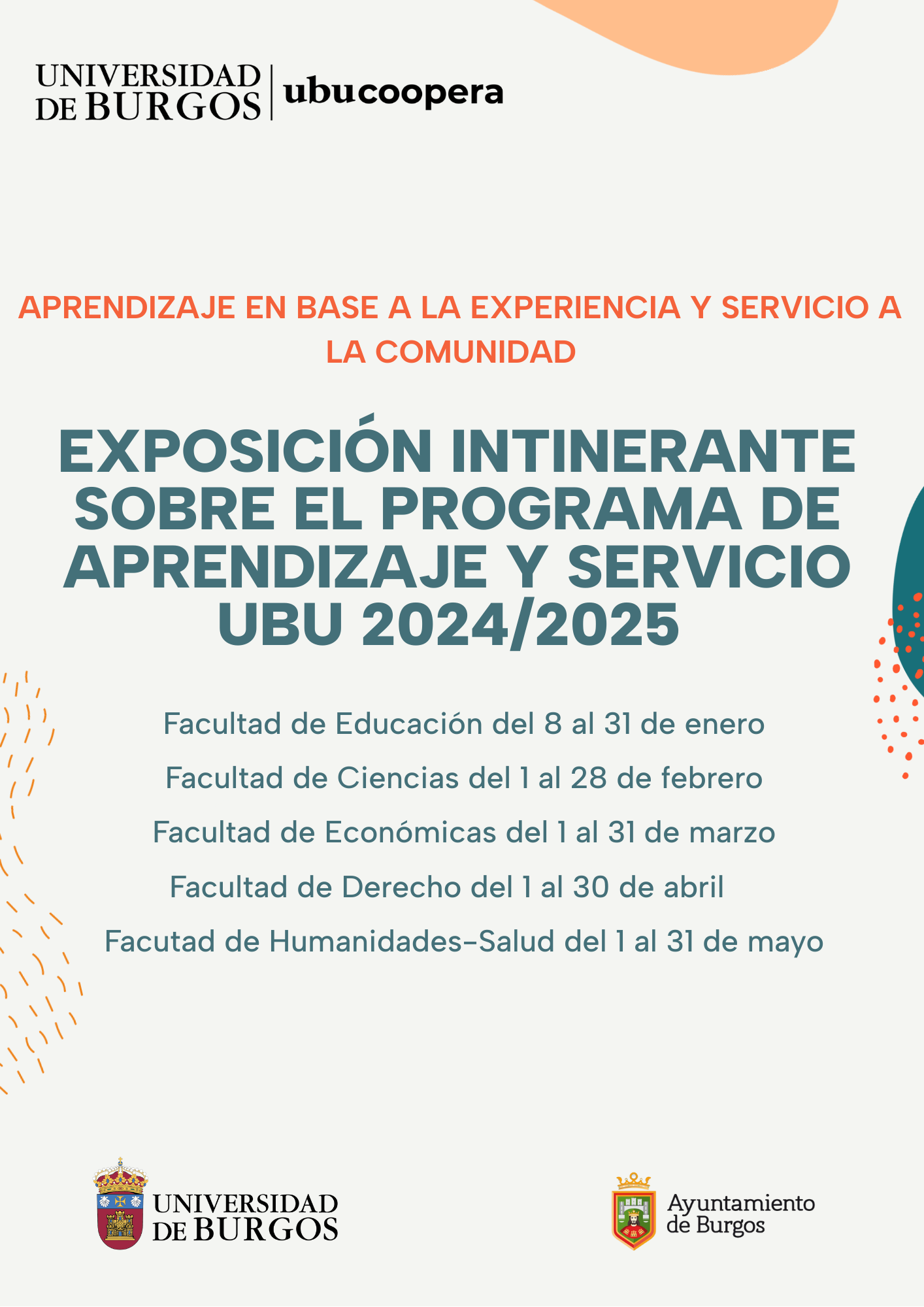 La Comisión de Aprendizaje-Servicio de la UBU, en colaboración con el Ayuntamiento de Burgos, organiza una exposición itinerante sobre el programa de Aprendizaje y Servicio 2024/2025. En las distintas facultades de la Universidad de Burgos, durante los meses de enero a mayo, se compartirá con los miembros de la comunidad universitaria el trabajo realizado por profesorado y estudiantes de diferentes titulaciones de grado y posgrado, a través de exposiciones que incorporan el contexto, los objetivos, los resultados y las conclusiones, y que reflejan, a su vez, el compromiso, la constancia y el entusiasmo dedicados a cada uno de los proyectos desarrollados.