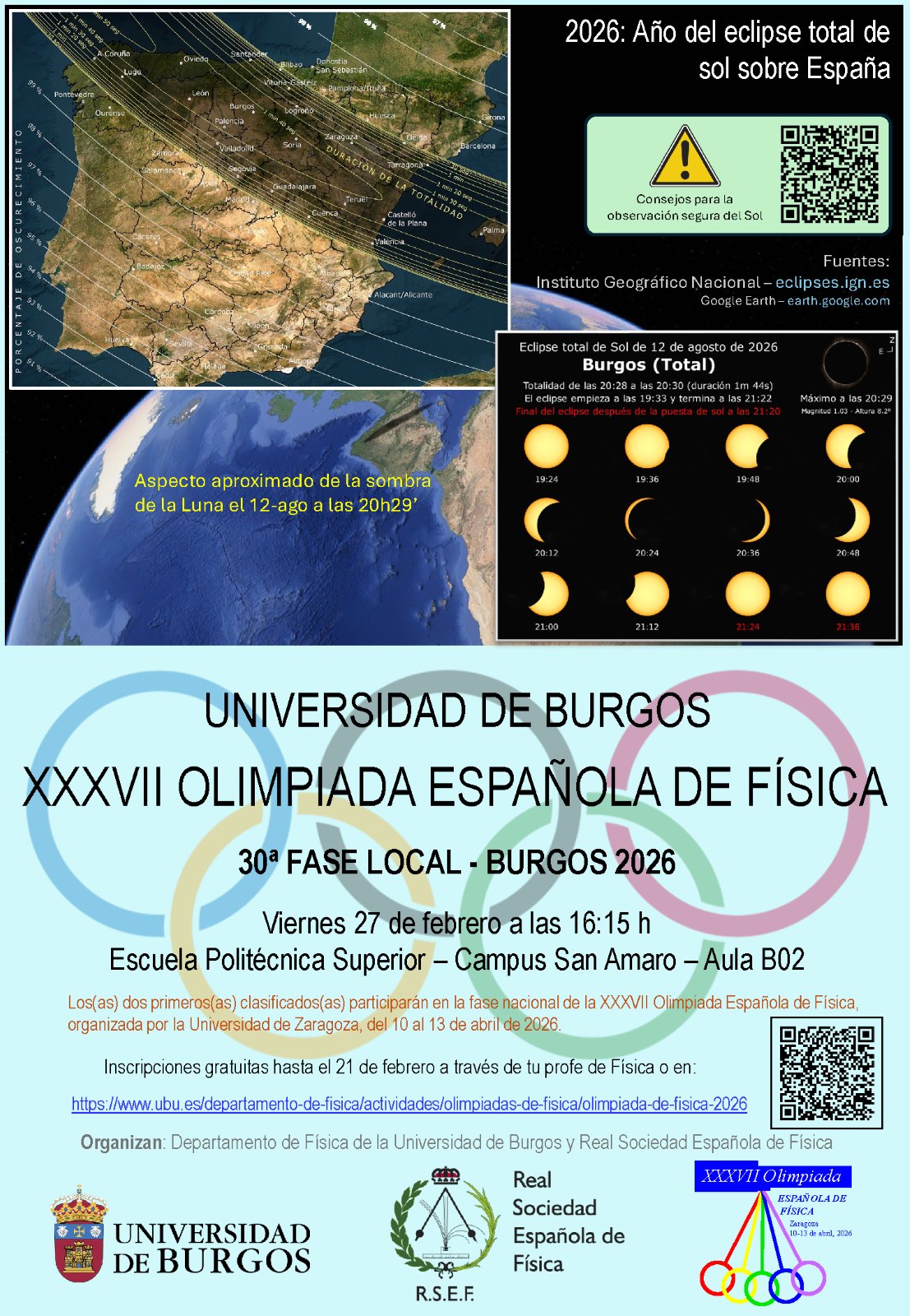 Este año, el Comité Local de Burgos se ha sumado a la difusión de los tres eclipses solares visibles en España entre 2026 y 2028, con especial atención al eclipse total del 12 de agosto de 2026, un fenómeno excepcional que no volverá a repetirse hasta 2053 y al que ha dedicado el cartel de la actividad para promover su conocimiento y resaltar su importancia científica. Con esta iniciativa, el comité busca despertar el interés por la ciencia y subrayar el papel clave de los eclipses en avances como el estudio de la corona solar o la validación de la relatividad general. El cartel de la Olimpiada recoge información práctica sobre el paso de la franja de totalidad por Burgos, las condiciones de observación y las medidas de seguridad, integrando divulgación y educación científica en el marco de la competición.