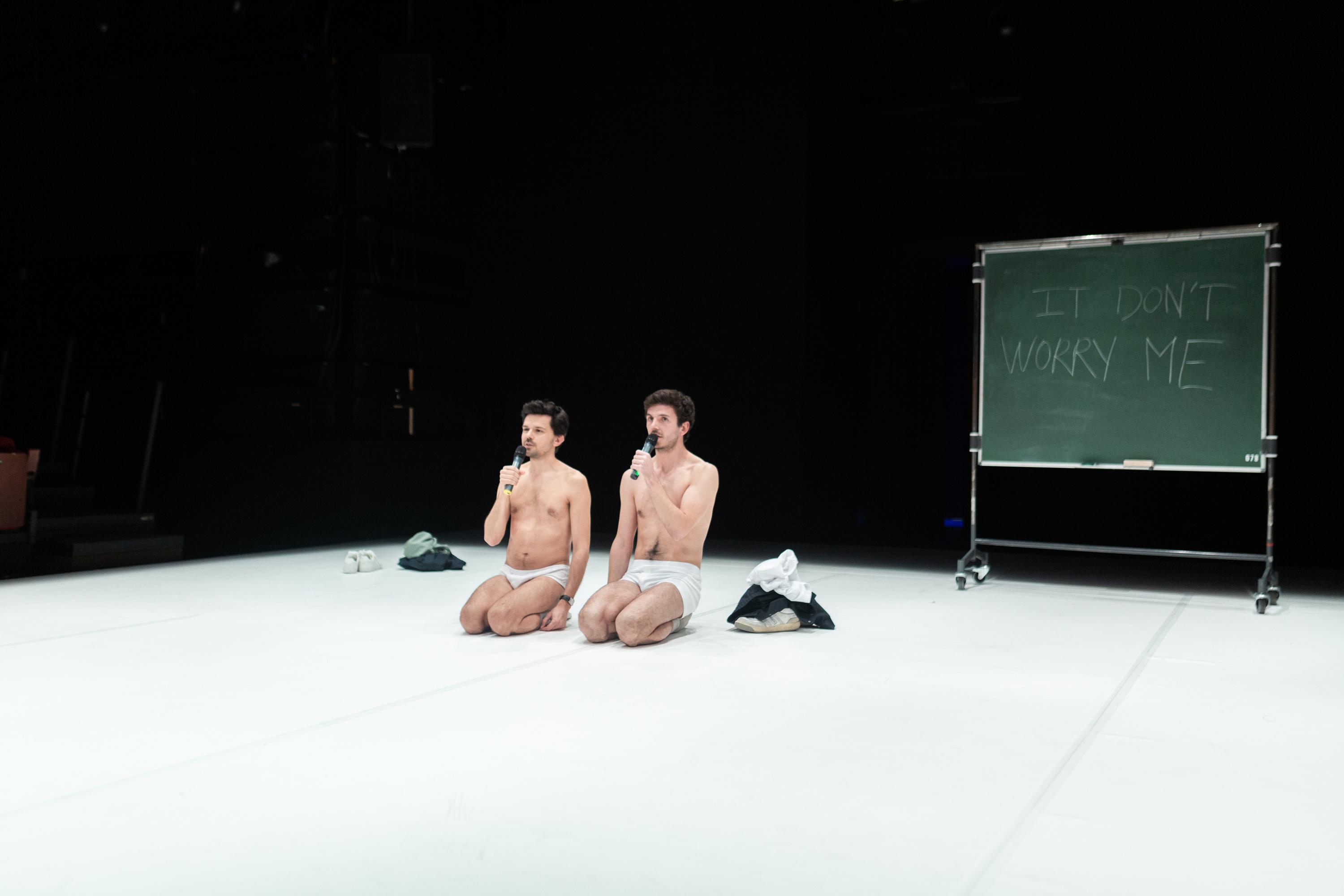 I It don’t worry me pone en escena un dispositivo en el que dos comentaristas comentan una obra de teatro que no deja de ser ellos mismos comentándola. Un juego escénico en forma de espiral que sirve para surfear por temas como la corrección política en el mundo del arte.