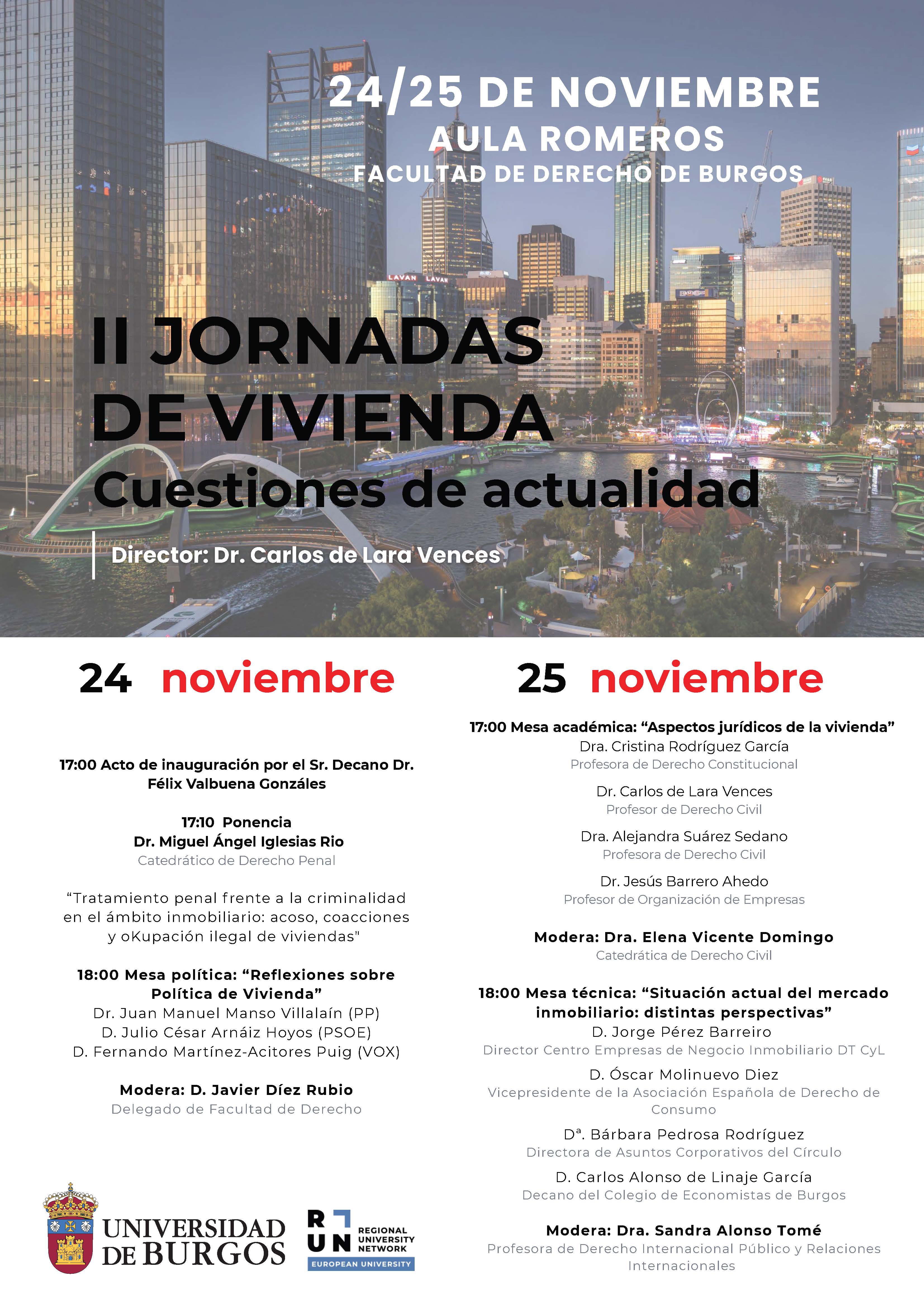 La Universidad de Burgos acoge las II Jornadas de Vivienda, que se celebrarán el 24 y 25 de noviembre en el Aula Romeros (Facultad de Derecho).