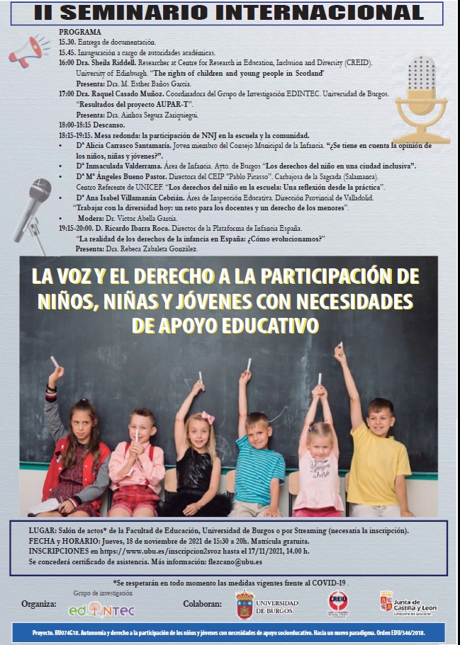 El 20 de noviembre se celebra el Día Internacional de los Derechos de la Infancia y para contribuir a esa destacada fecha, el Grupo de Investigación “Educación, Inclusión y Tecnología” (EDINTEC) de la Universidad de Burgos organiza el II Seminario Internacional: “La voz y el derecho a la participación de niños, niñas y jóvenes con necesidades de apoyo educativo”