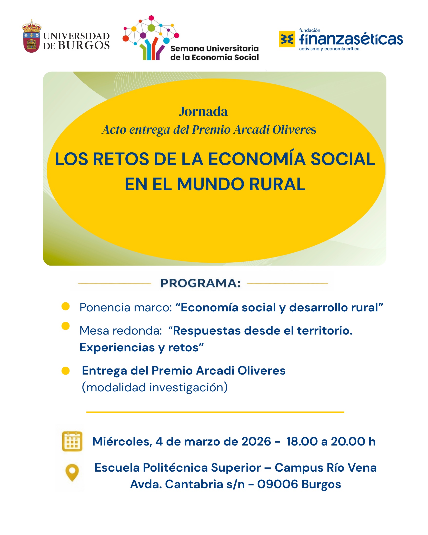 La Universidad de Burgos acoge el próximo miércoles 4 de marzo la jornada “Los retos de la economía social en el mundo rural”, organizada en el marco de la Semana Universitaria de la Economía Social, en colaboración con la Fundación Finanzas Éticas.