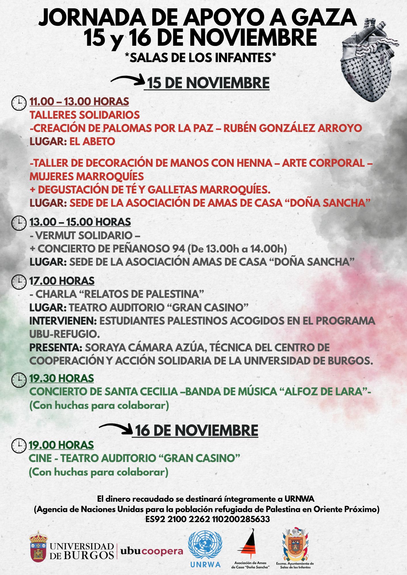 Un grupo de personas voluntarias de Salas de los Infantes, en colaboración con el Ayuntamiento de Salas de los Infantes, la Asociación Amas de Casa "Doña Sancha" y el Centro de Cooperación y Acción Solidaria de la Universidad de Burgos, organizan una Jornada de Apoyo a Gaza. Durante la misma, se realizarán talleres artísticos y de henna, dos conciertos solidarios (del grupo local Peñanoso 94 a la hora del vermut y de la Banda de Música "Alfoz de Lara" por la tarde-noche) y una conferencia protagonizada por los estudiantes beneficiarios de los Programa UBU-Refugio procedentes de Gaza, con el fin de conocer más de cerca el conflicto y sus consecuencias.