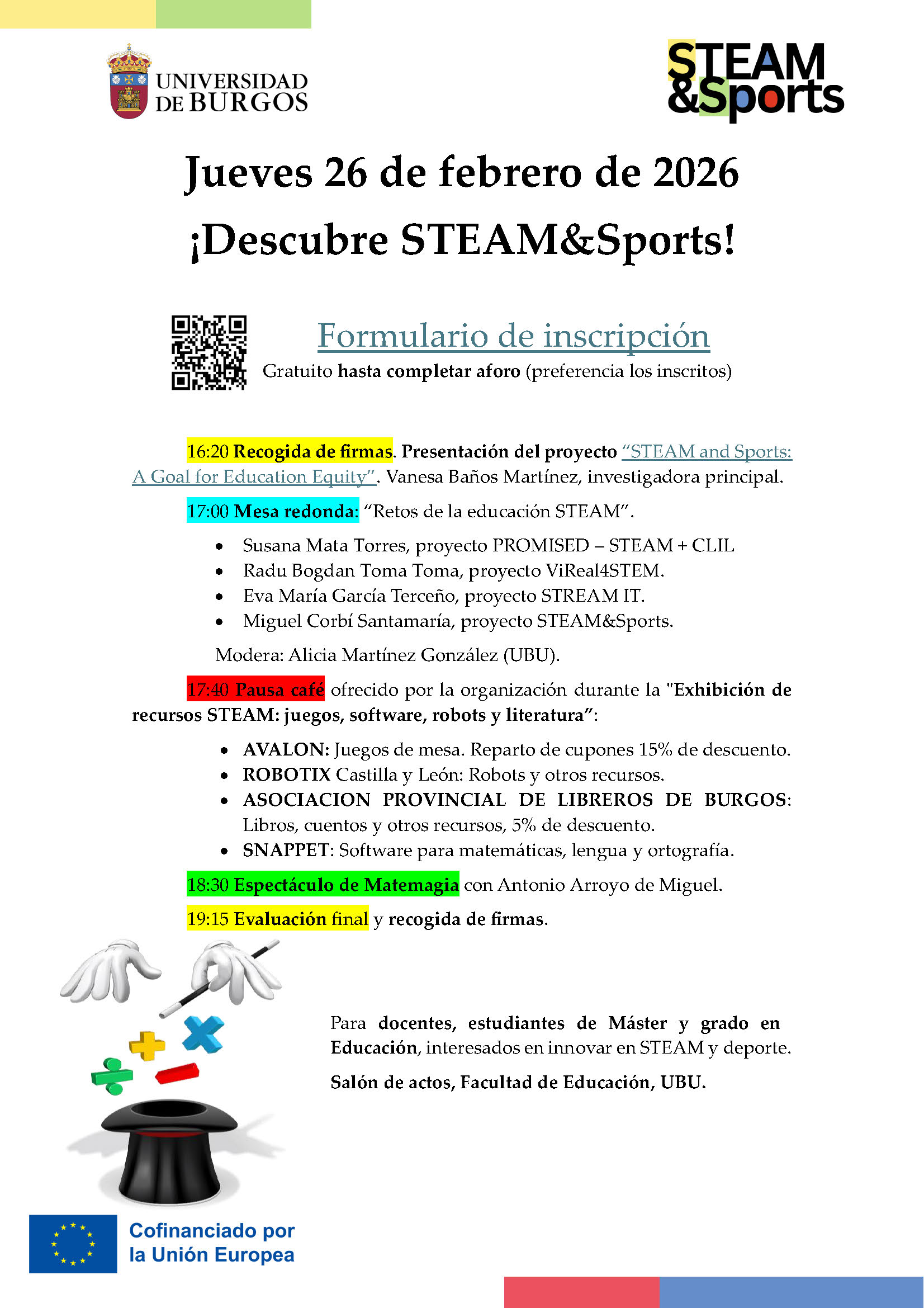 El programa incluye una presentación del proyecto y una mesa redonda en al que se abordarán los retos de la educación STEAM de docentes e investigadores de la Universidad de Burgos. A continuación, diferentes empresas y asociaciones presentarán diversos recursos STEAM, como juegos, software, robots y literatura. Por último, el profesor Antonio Arroyo Miguel ofrecerá un espectáculo de Matemegia.