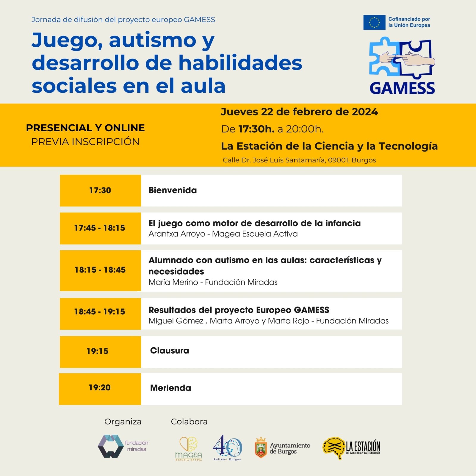 La tarde concluirá con una exposición sobre lo que ha sido y los resultados alcanzados en el proyecto GAMESS, a cargo de Miguel Gómez, Marta Arroyo y Marta Rojo, de Fundación Miradas, quienes darán su testimonio como participantes en el proyecto europeo GAMESS que sirve de marco a esta jornada.