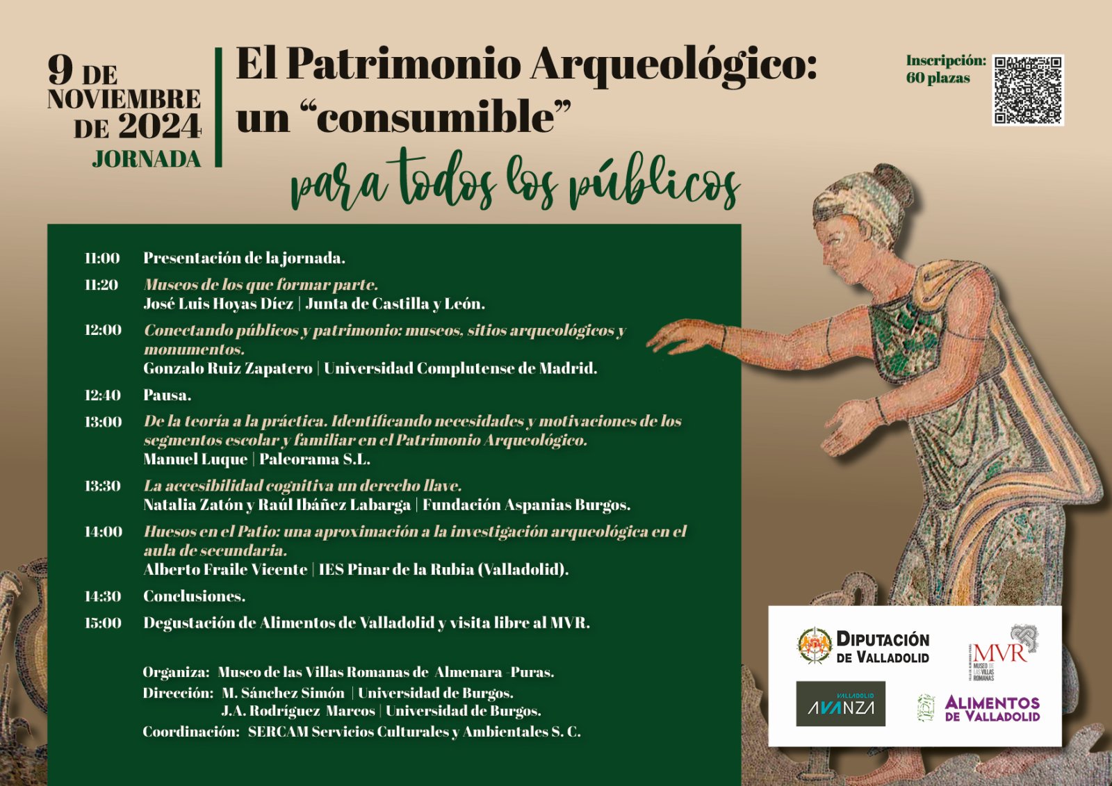 El 9 de noviembre de 2024 se celebra la Jornada “El Patrimonio Arqueológico: un “consumible” para todos los públicos” en el Museo de las Villas Romanas de Almenara-Puras (MVR), en Valladolid, dirigida por los profesores de la Universidad de Burgos (UBU) Margarita Sánchez Simón, del Área de Historia Antigua y José Antonio Rodríguez Marcos, del Área de Prehistoria.