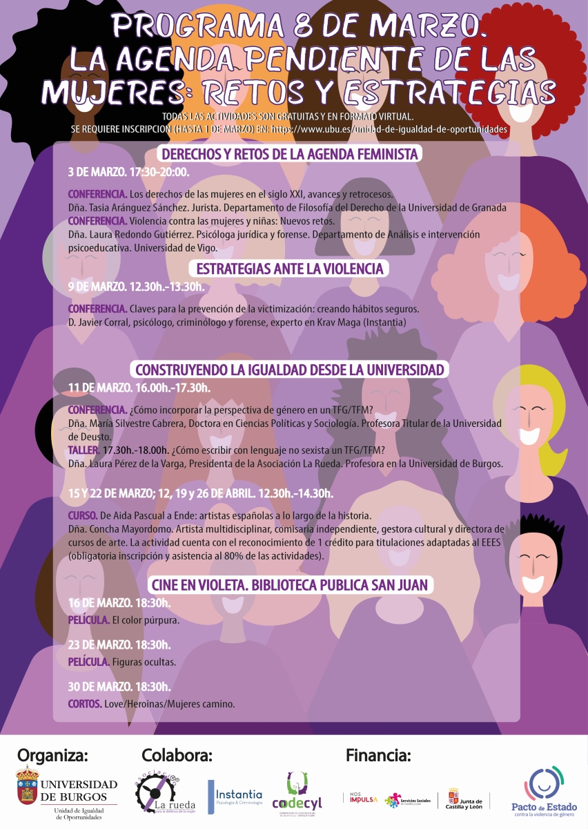 Con motivo del Día Internacional de las Mujeres, el 8 de marzo, la Unidad de Igualdad de Oportunidades de la Universidad de Burgos ha elaborado un amplio programa de actividades, un ciclo de conferencias, cine, cursos y talleres, que se desarrollarán del 3 al 15 de marzo, con el propósito de sensibilizar en igualdad a toda la comunidad universitaria.