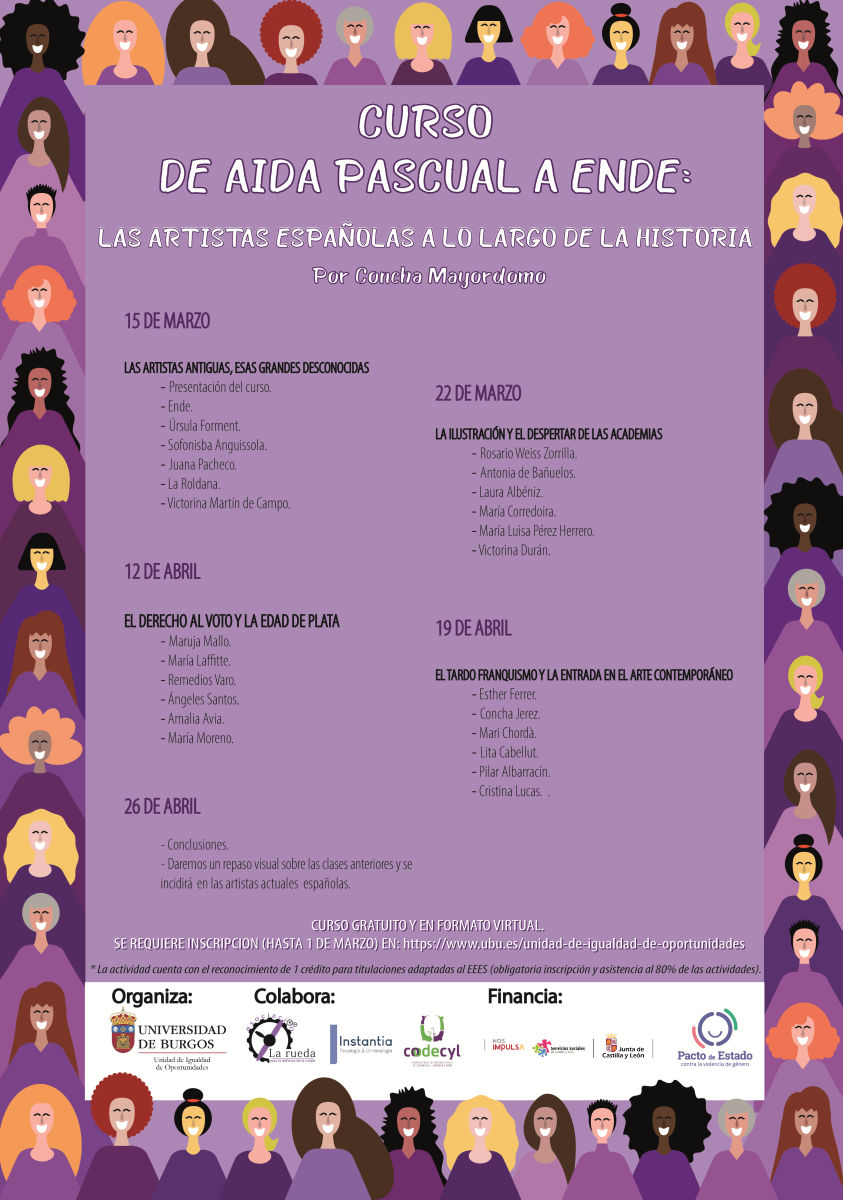 El día 15 de marzo comenzará un curso titulado “De Aida Pascual a Ende: artistas españolas a lo largo de la historia”. El curso se impartirá a lo largo de cinco lunes y será impartido por Concha Mayordomo, artista multidisciplinar, comisaria, gestora cultura y directora de cursos de arte.