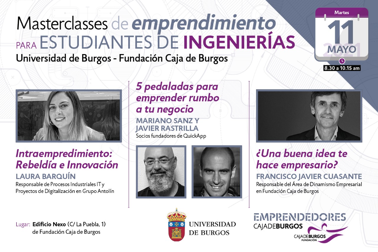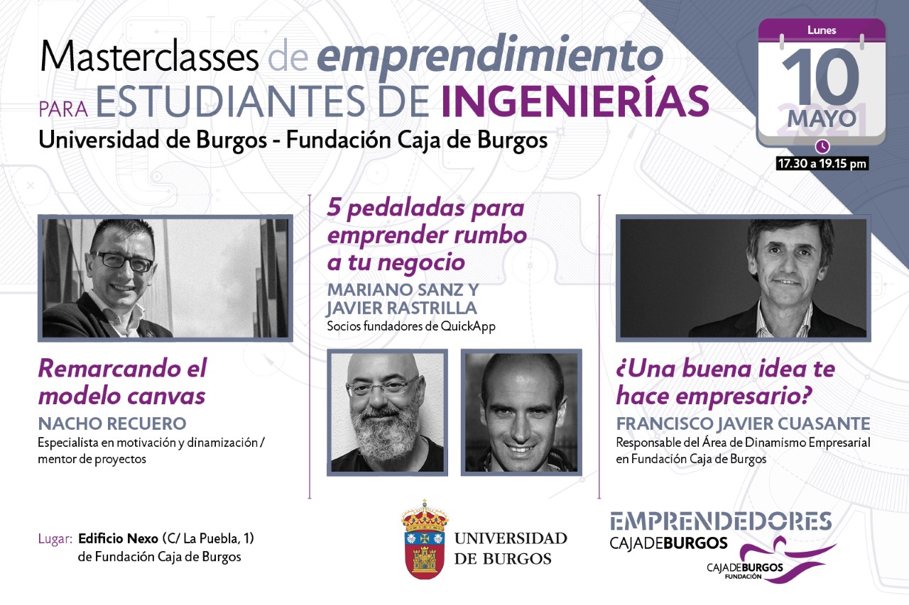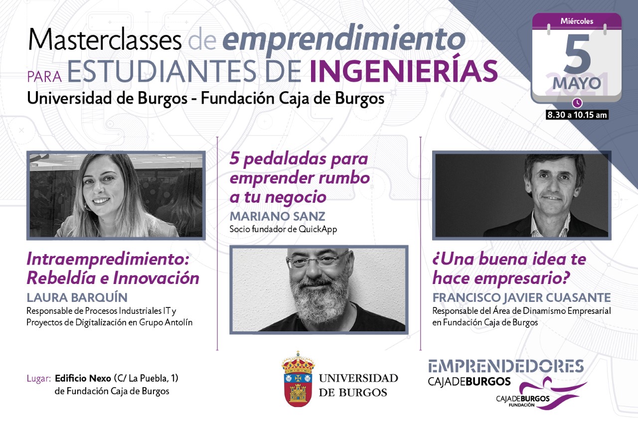 El Centro de Dinamismo Empresarial de la Fundación Caja de Burgos, situado en el Edificio Nexo (La Puebla, 1), acoge durante el mes de mayo una serie de masterclasses de emprendimiento organizadas por la Fundación Caja de Burgos y la Universidad de Burgos y dirigida a estudiantes de ingenierías del campus burgalés.