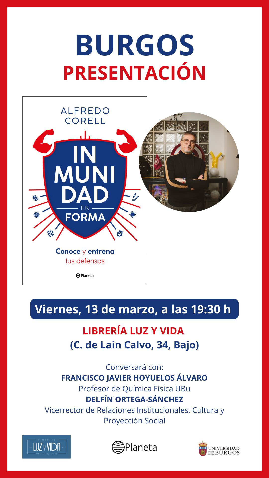 El inmunólogo y divulgador Alfredo Corell Almuzara presenta el viernes 13 de marzo a las 19:30 h el libro ‘Inmunidad en forma. Conoce y entrena tus defensas’, en una conversación en la librería Luz y Vida junto al profesor de Química Física de la UBU Javier Hoyuelos Álvaro y el vicerrector de Relaciones Institucionales, Cultura y Proyección Social, Delfín Ortega Sánchez.