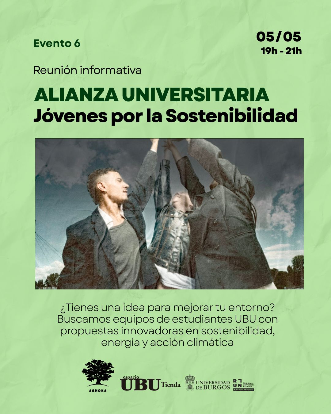 Se trata de un programa que busca equipos de jóvenes con ideas innovadoras capaces de generar un impacto positivo en su entorno, especialmente en ámbitos relacionados con la transición energética, la sostenibilidad y la acción climática. Con el objetivo de dar a conocer todos los detalles del programa, el próximo 5 de mayo, de 19:00 a 21:00 h, tendrá lugar una reunión informativa en el espacio UBU Tienda en la que el alumnado podrá recibir información de primera mano y se resolverán dudas.