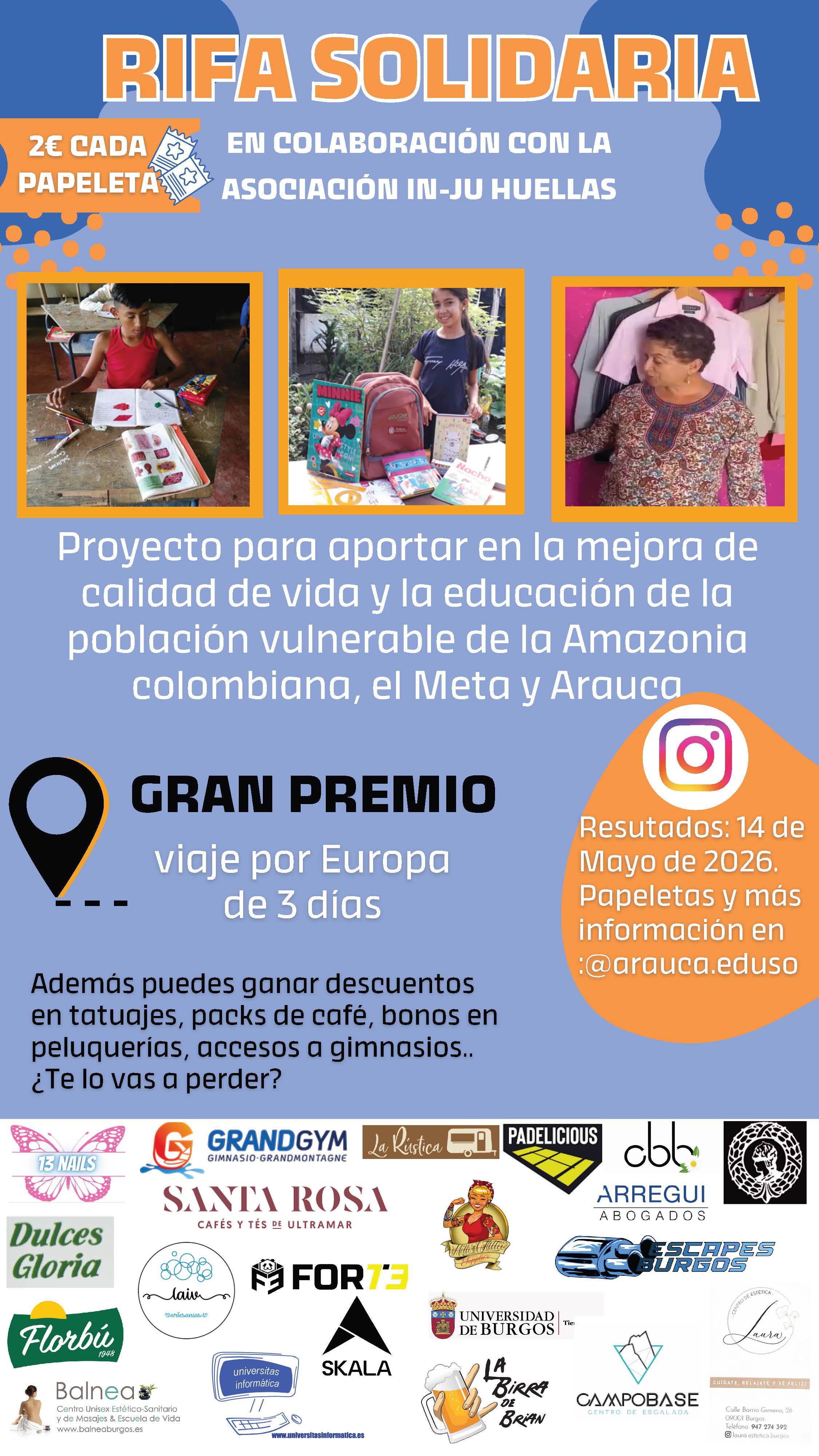 Los tickets de la paella tienen un precio de 7 euros y los boletos de la rifa 2 euros, con un gran premio de un viaje por Europa de tres días de duración. Los premios se darán a conocer en el perfil de Instagram arauca.eduso.