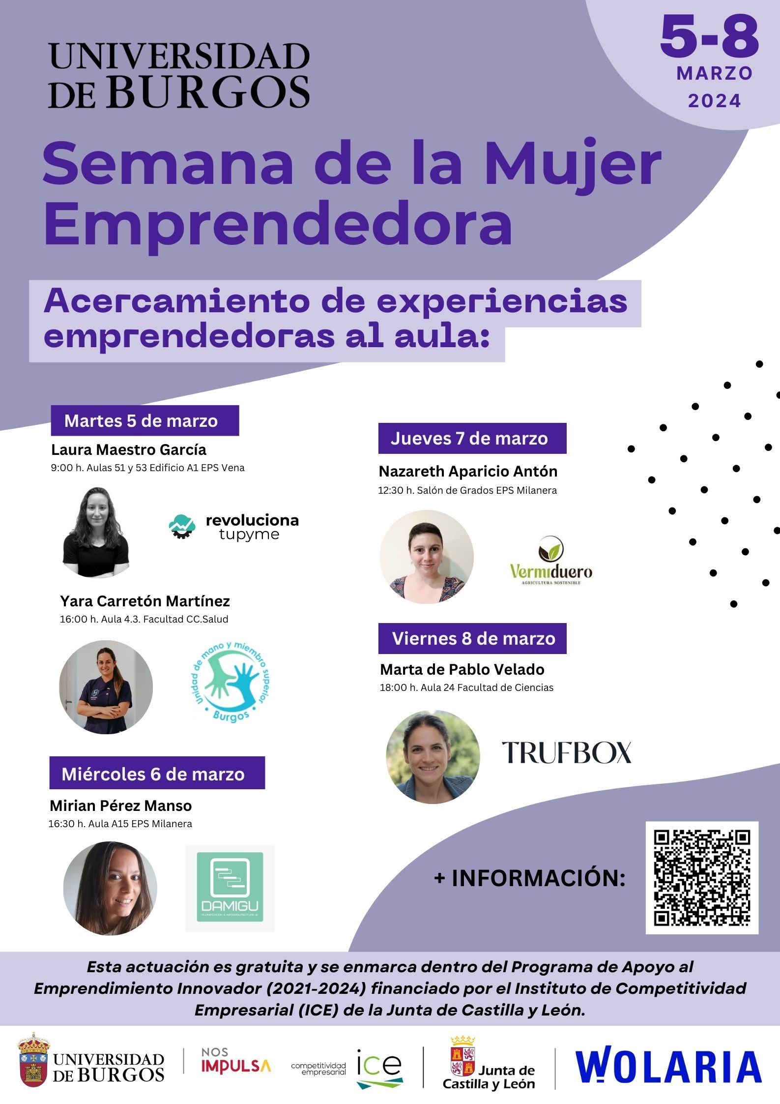 Con motivo del Día Internacional de la Mujer y en el marco del Programa de Apoyo al Emprendimiento Innovador (2021-2024) financiado por el ICE, desde el Servicio universitario de empleo, hemos organizado una serie de encuentros con emprendedoras de éxito en distintos sectores, quienes se acercarán a diferentes aulas de la Universidad de Burgos para compartir con los estudiantes su experiencia emprendedora.