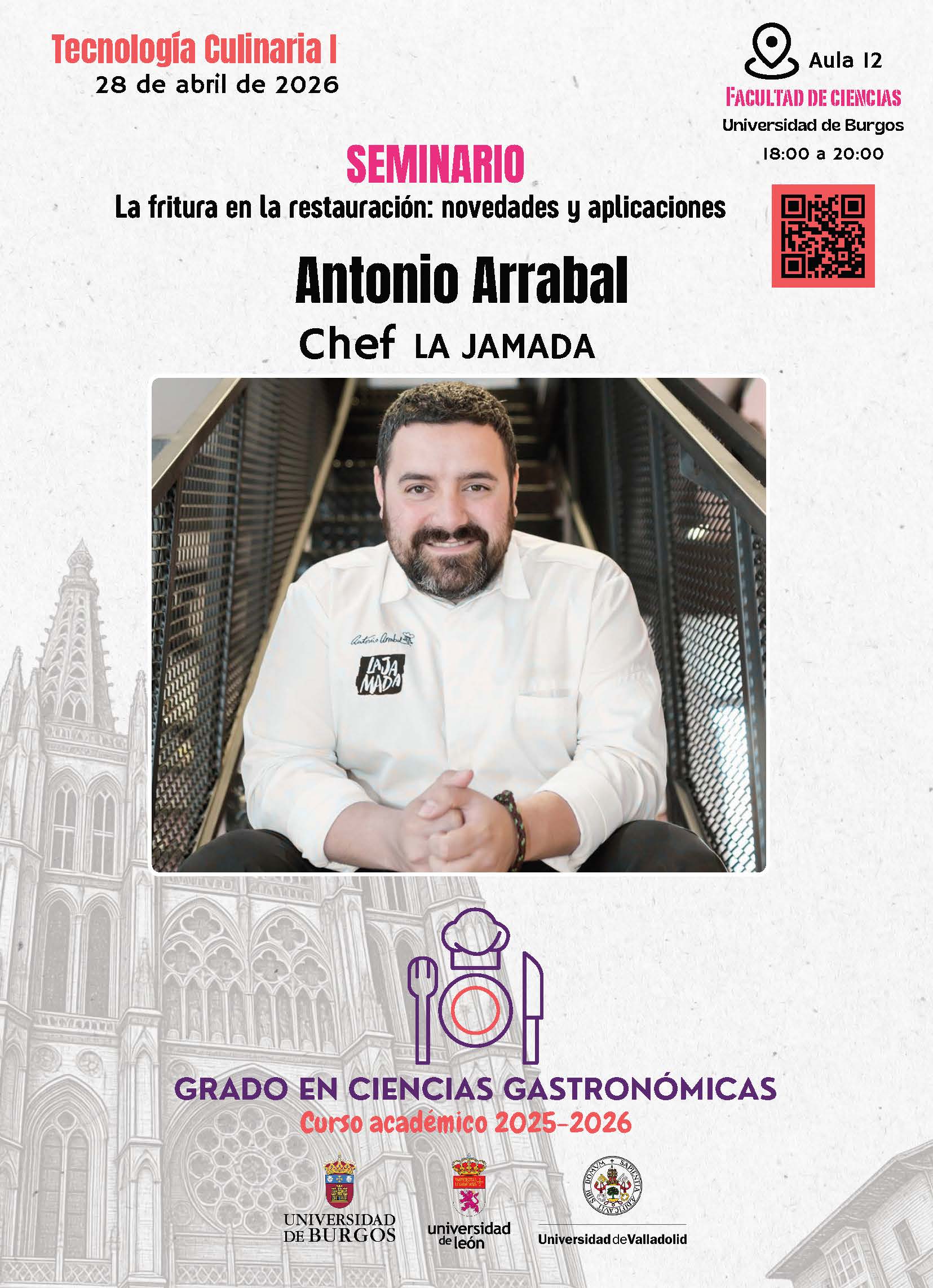 Antonio Arrabal, chef de los restaurantes La Jamada y La Bodeguilla de Arrabal y director de LAB Jamada, imparte la charla–taller “La fritura en la restauración: novedades y aplicaciones”. La actividad, organizada de manera conjunta por la Universidad de Burgos, la Universidad de Valladolid y la Universidad de León dentro de la parte común de la parte común de la asignatura Tecnología Culinaria I del Grado en Ciencias Gastronómicas, está dirigida especialmente al alumnado de esta titulación, que podrán seguirla también de manera online a través de Teams, aunque se abrirá al público en general hasta completar aforo.