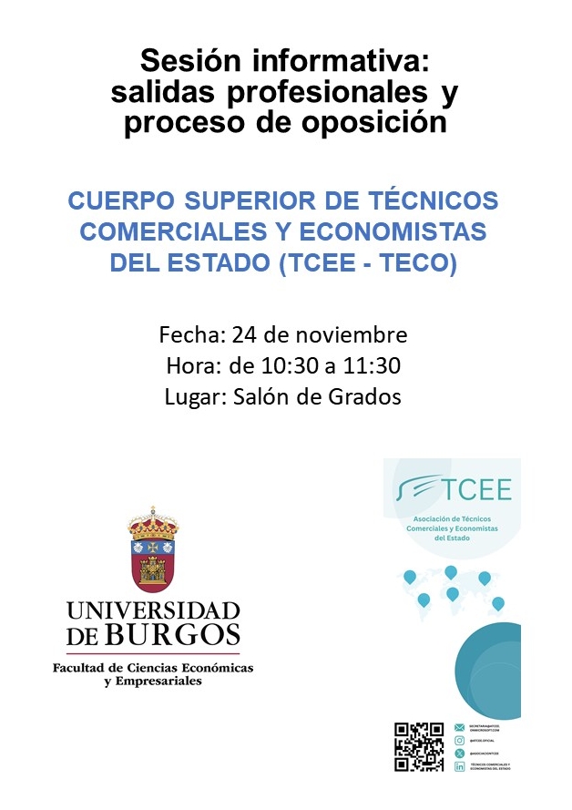 El 24 de noviembre, de 10.30 a 11.30 h, en el Salón de Grados de la Facultad de Ciencias Económicas y Empresariales, tendrá lugar una sesión informativa sobre las salidas profesionales y proceso de oposición del Cuerpo Superior de Técnicos Comerciales y Economistas del Estado (TCEE-TECO).