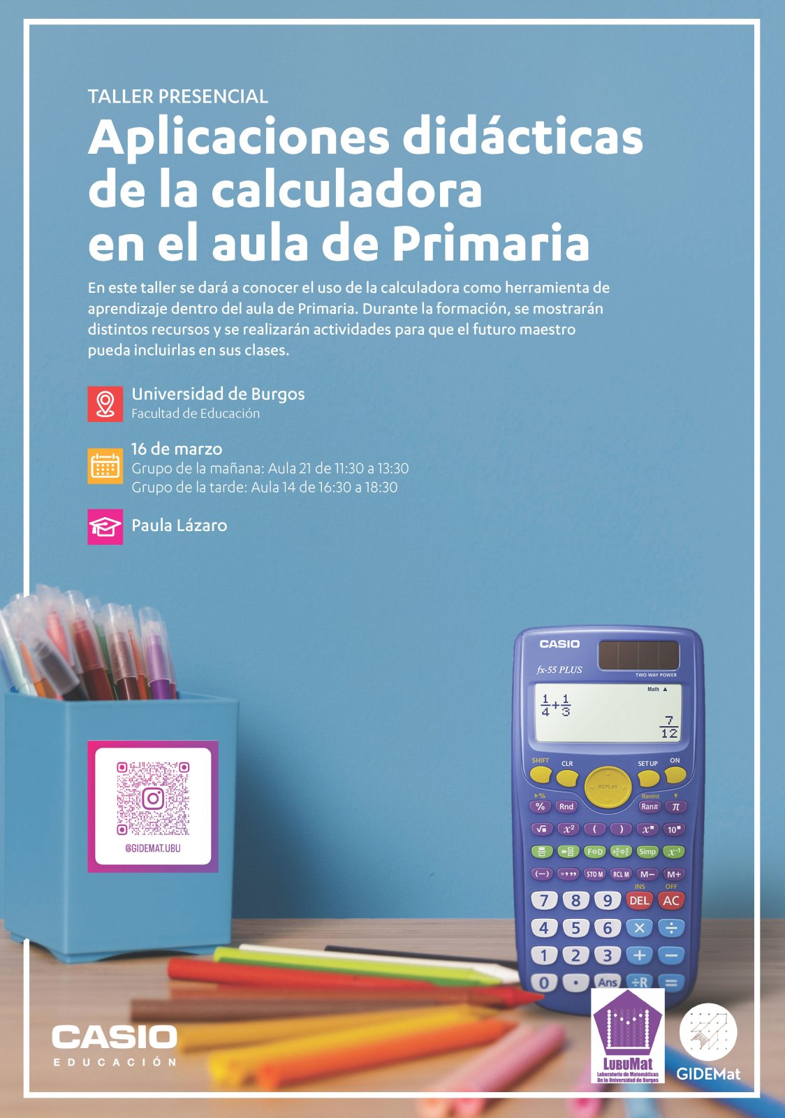 El grupo de Innovación Docente GIDEMat en colaboración con Casio Educación organizan el lunes, 16 de marzo de 2026, el taller “Aplicaciones didácticas de la calculadora en el aula de Primaria”.