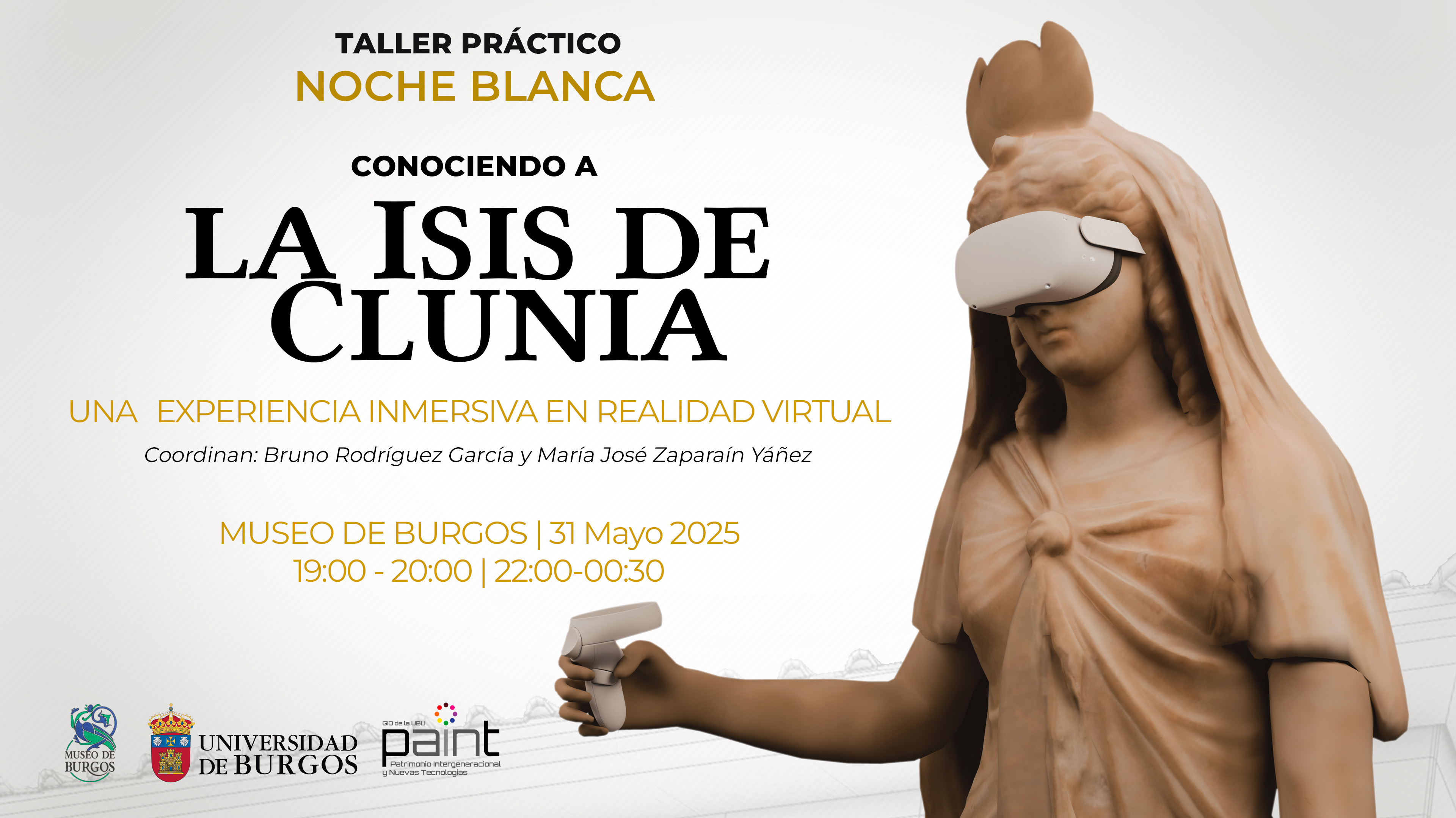 La Noche Blanca, que se celebra el sábado 31 de mayo, acoge la experiencia inmersiva en realidad virtual ‘Conociendo a la Isis de Clunia’, creada por el Grupo de Innovación Docente PAINT (Patrimonio Intergeneracional y Nuevas Tecnologías). Tendrá lugar en el Museo de Burgos en dos pases: de 19 a 20h. y de 22 a 00:30 h.