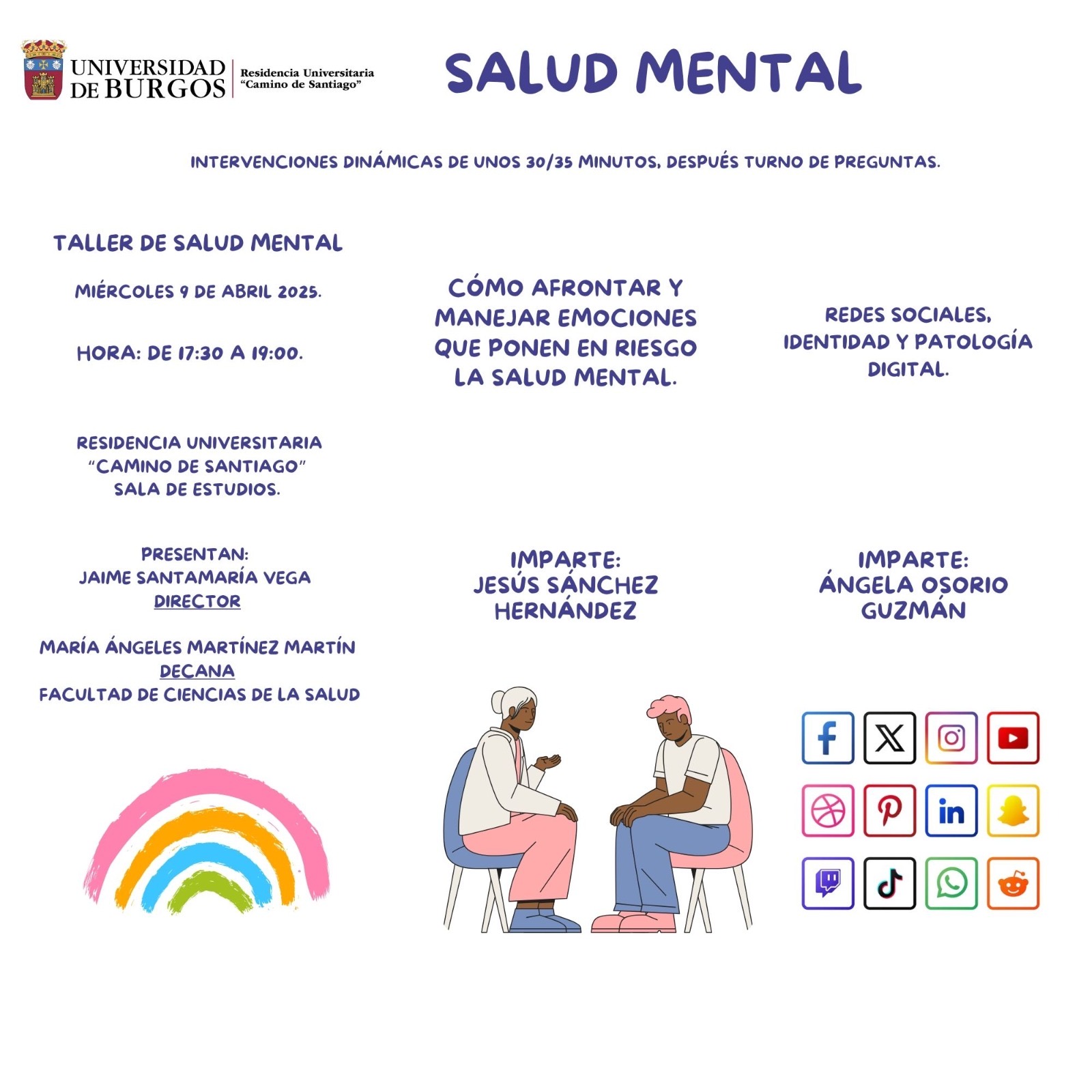 La Residencia Universitaria Camino de Santiago de la Universidad de Burgos (RUCS) organiza, el miércoles 9 de abril a partir de las 17:30 h, un "Taller de Salud Mental" abierto a toda la ciudadanía.