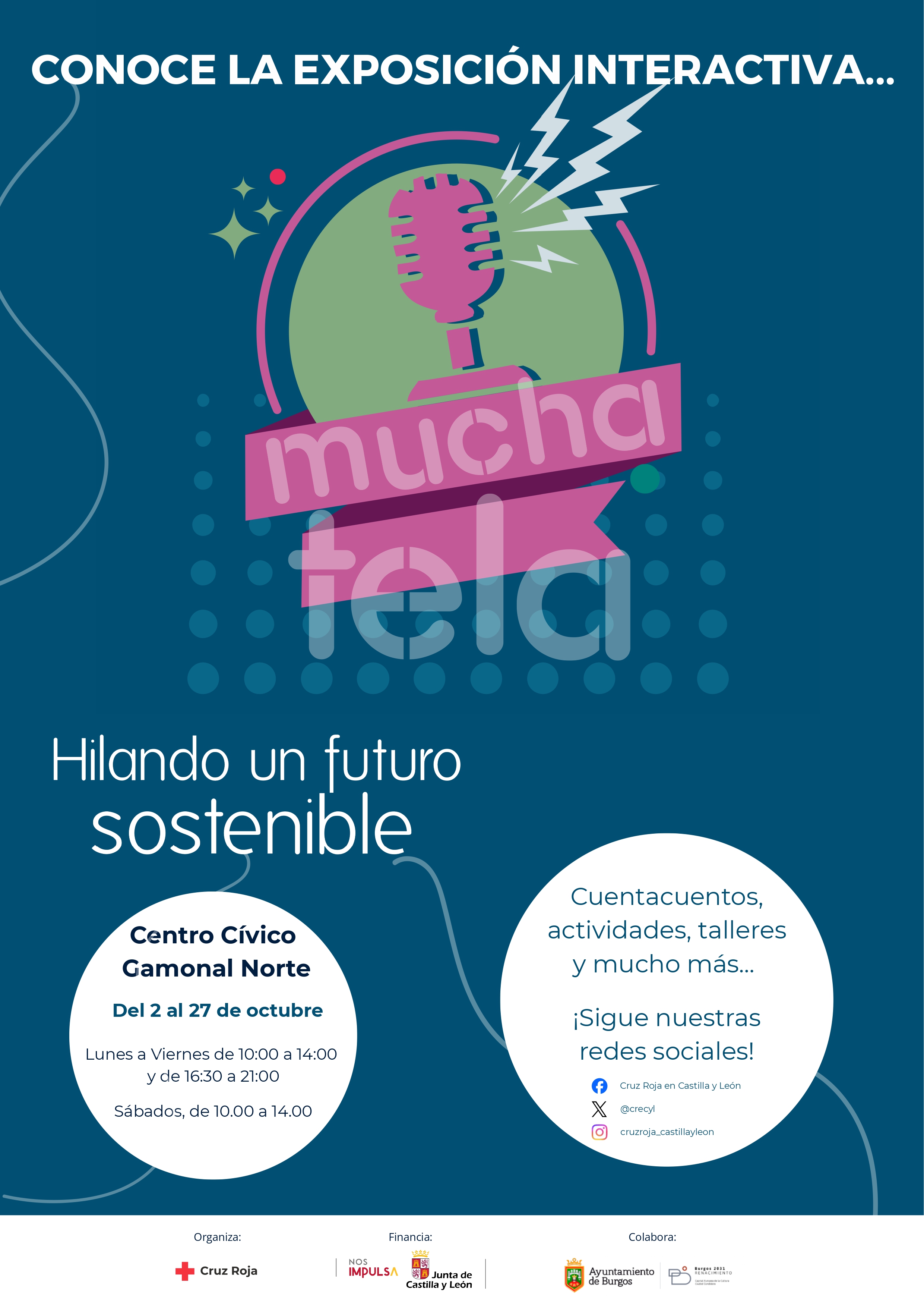 La Oficina Verde de la Universidad de Burgos (UBUverde), en colaboración con la Junta de Castilla y León y el Ayuntamiento de Burgos expresa su apoyo a esta iniciativa de CRUZ ROJA BURGOS (Medio Ambiente) con una Visita Guiada a la Exposición Ambiental Interactiva Mucha Tela… hilando un futuro sostenible, que estará abierta del 1 al 25 de octubre en el Centro Cívico Gamonal Norte; c/ José Mª Codón 2.