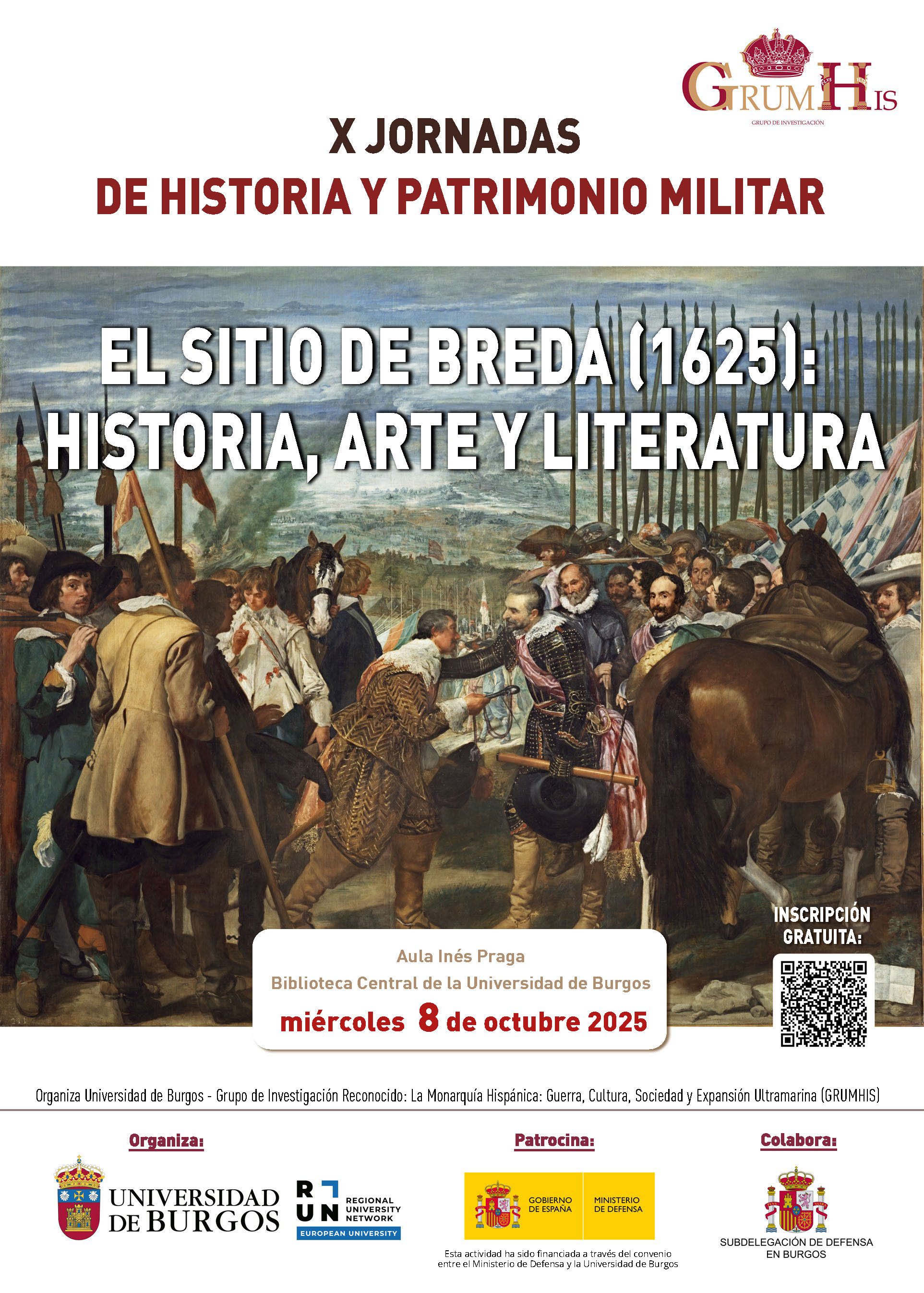 El miércoles, 8 de octubre, la Universidad de Burgos celebra las X Jornadas de Historia y Patrimonio Militar que, bajo el título “El sitio de Breda (1625): Historia, Arte y Literatura”, recuerdan este hecho histórico que ha servido de inspiración a literatos y artistas y del que en 2025 se conmemora el cuarto centenario.