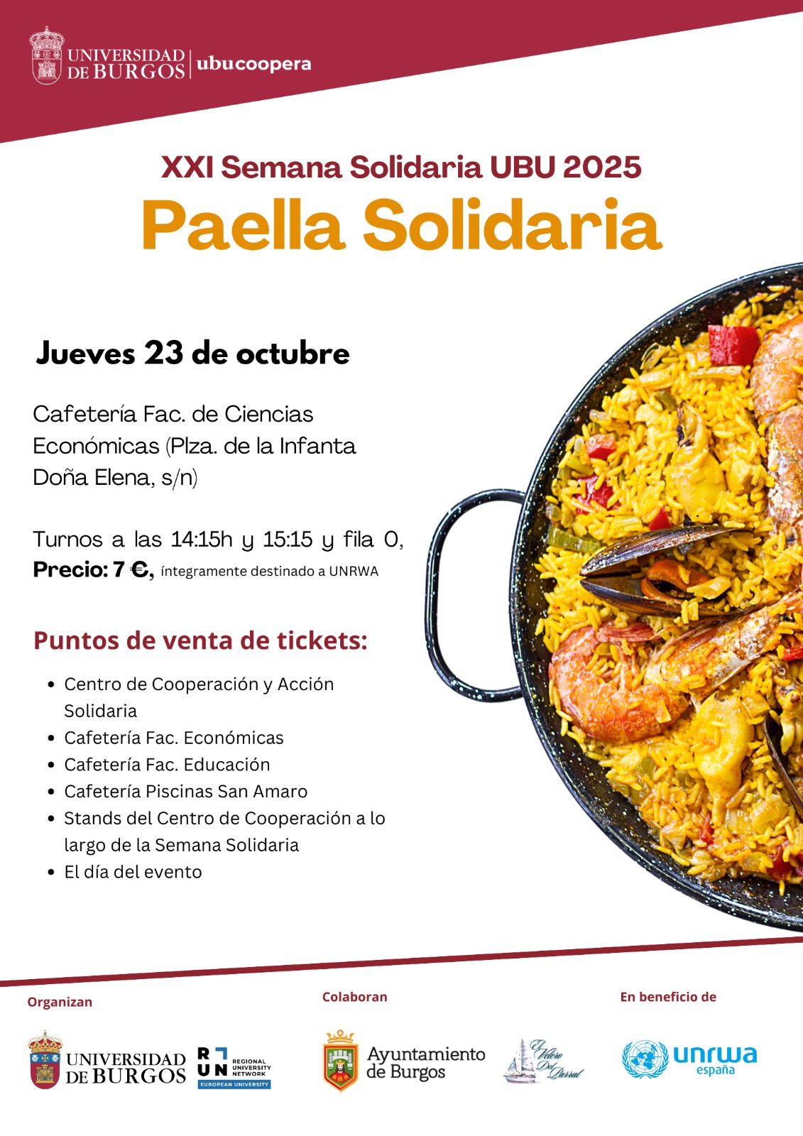 El Centro de Cooperación y Acción Solidaria organiza el próximo 23 de octubre una Paella Solidaria en la cafetería de la Facultad de Ciencias Económicas y Empresariales. El dinero recaudado irá destinado a UNRWA para todos los programas que tienen en la Franja de Gaza y Cisjordania.