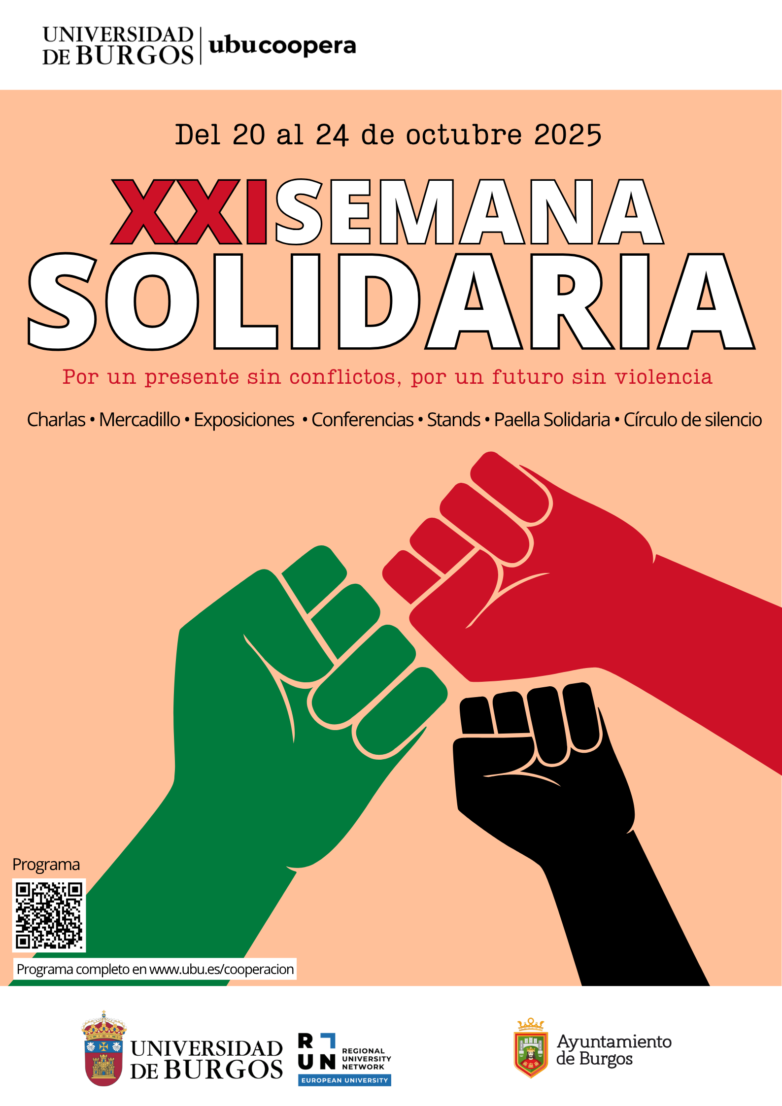 La Universidad de Burgos lleva años apostando por la sensibilización de los más jóvenes y su formación como ciudadanos críticos con la realidad que les rodea. Una de las actividades más destacadas en este sentido es la Semana Solidaria, que -con la financiación que se recibe del Ayuntamiento de Burgos- organiza el Centro de Cooperación y Acción Solidaria de la Universidad de Burgos, junto al grupo de personas que han colaborado en su preparación, mostrando su voluntad de continuar trabajando para que en la comunidad universitaria se desarrollen los valores de la solidaridad y para que la Universidad se convierta en un espacio de reflexión y debate sobre los problemas que se viven en las sociedades actuales.