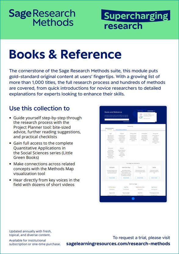 - Books & Reference: Con una lista de más de 1.000 títulos, se cubre todo el proceso de investigación y cientos de métodos y proporciona acceso a dos herramientas fundamentales: el Project Planner y la herramienta de búsqueda gráfica Methods Map;