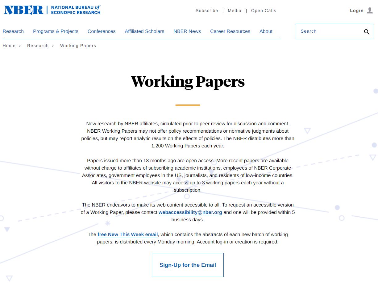 Para difundir toda esta actividad investigadora y facilitar la distribución de apéndices de datos y material relacionado, en 1973 inicia la publicación de NBER working paper series, en donde puedes buscar y localizar: