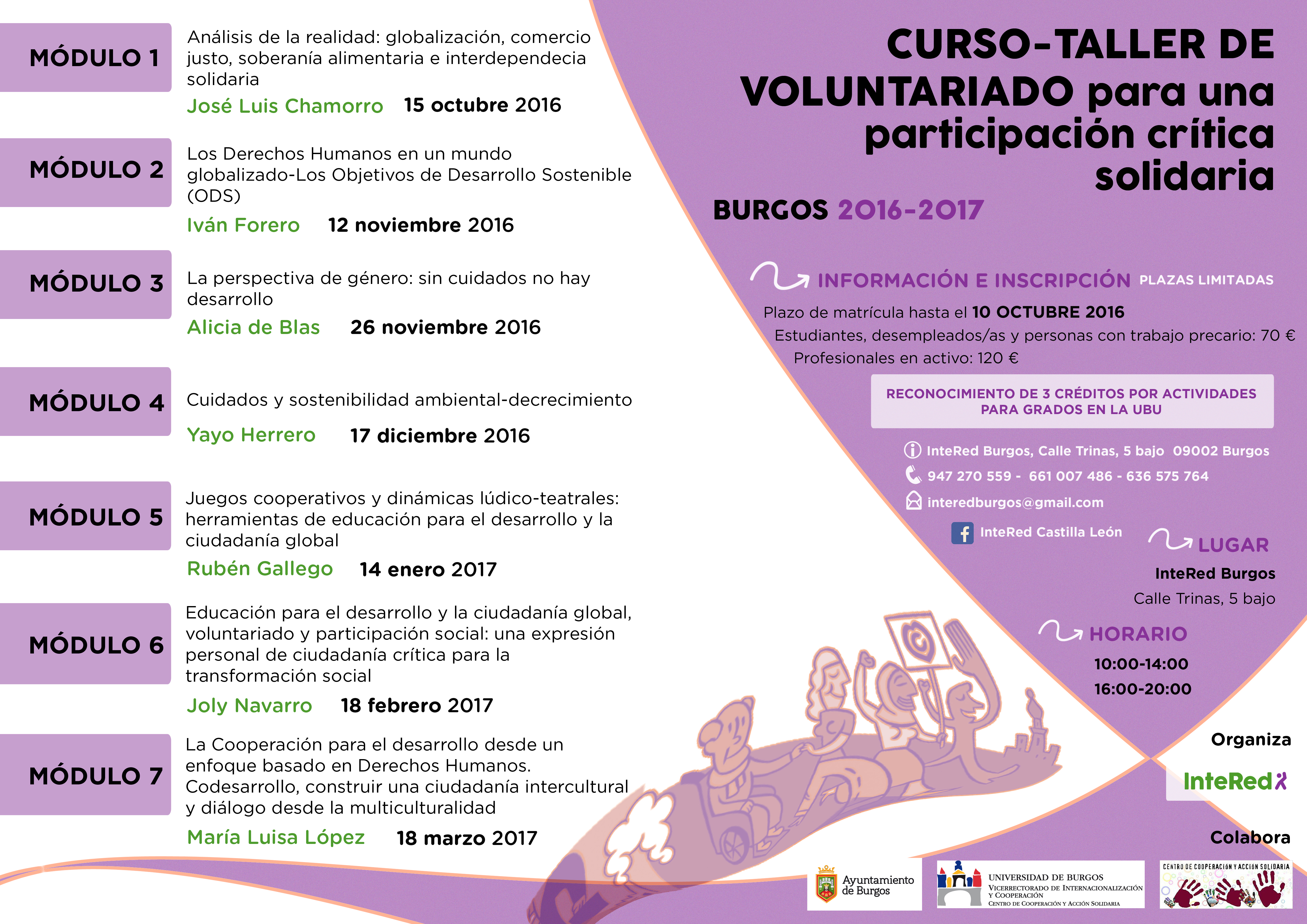 INSCRIPCIONES: Hasta el 10 de octubre de 2016 (Plazas limitadas) en interedburgos@gmail.com y en los teléfonos: 947 270 559 (sólo por las mañanas) 661 007 486 y 636 575 764
