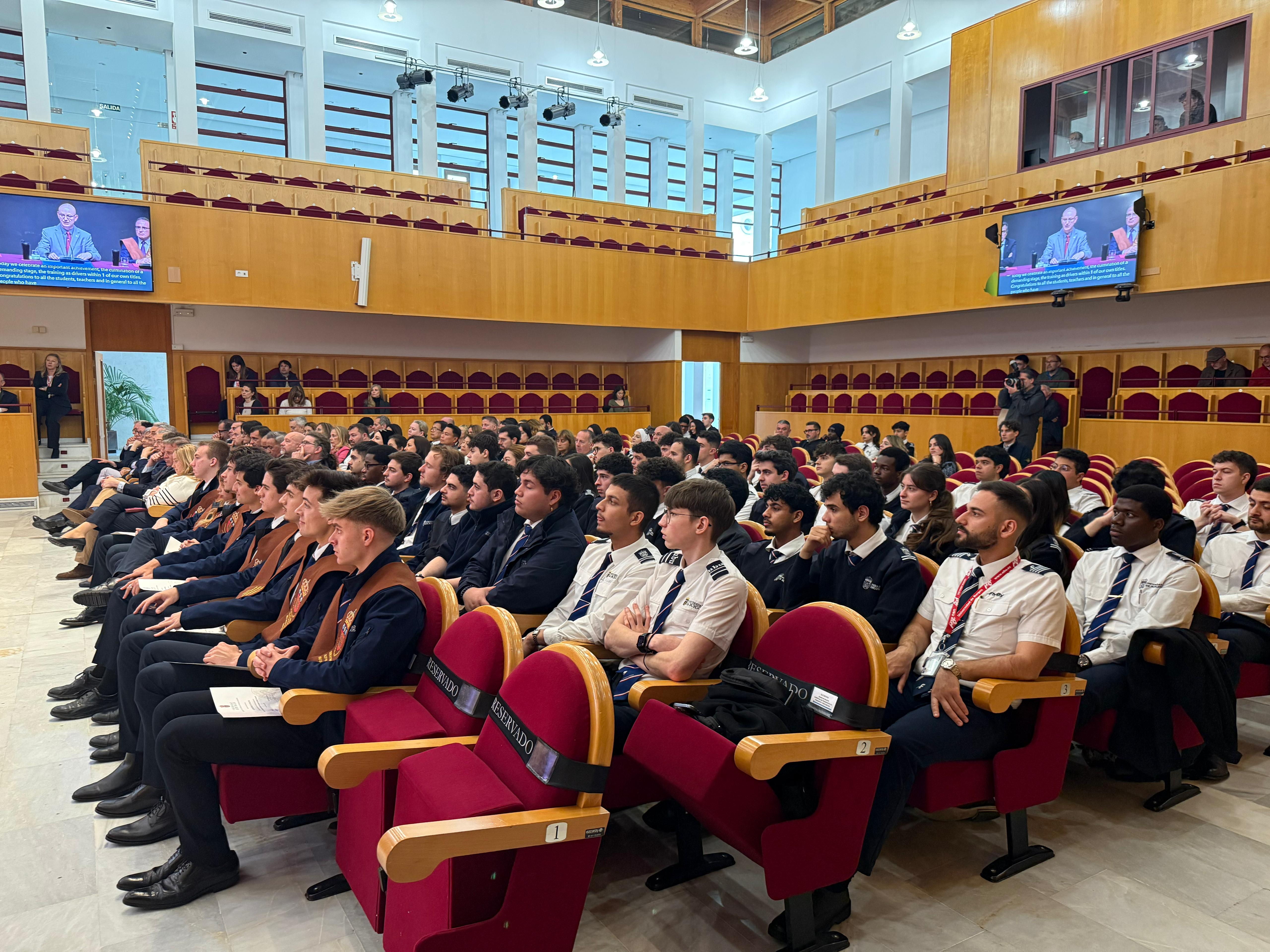 Por otro lado, Angela Gracia Pagkatipunan, la única mujer de esta promoción, dedicó unas bonitas palabras a sus compañeros: “Como la única chica de la promoción me preguntan como he lidiado con lo que tradicionalmente se conoce como liderado por hombres. La verdad nunca he sentido esa división, y esto es gracias a mis compañeros de clase, mis hermanos en este viaje. Me recibieron con calidez y me trataron como a un igual y me recordaron cada día que la camarada no entiende de género.” A su vez, citó una famosa frase que se ha convertido en el lema de la ceremonia: “El límite es el cielo. Tu cielo, tus límites”. Mathieu Andrés Fournel, el otro portavoz en representación de todos los alumnos, se despidió con estas afectuosas palabras: “Pronto seremos pilotos comerciales haciendo realidad nuestros sueños cada minuto del día. Y con eso os dejo dos reglas que espero no olvidéis. Siempre hay que seguir avanzando y evolucionando, y por supuesto, la regla de oro, aviar, navegar y comunicarse.”
