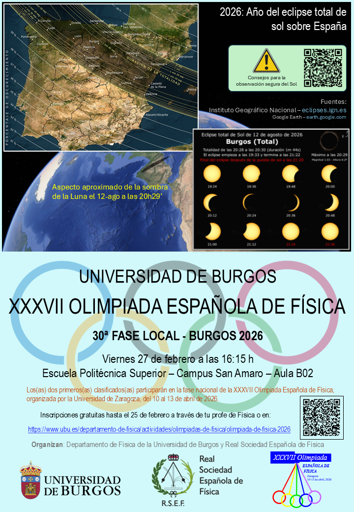 La Fase Local de la XXXVII Olimpiada Española de Física en la Universidad de Burgos se celebrará el viernes 27 de febrero de 2026 a las 16:15h en el Aula B02 de la Escuela Politécnica Superior, Campus Milanera.