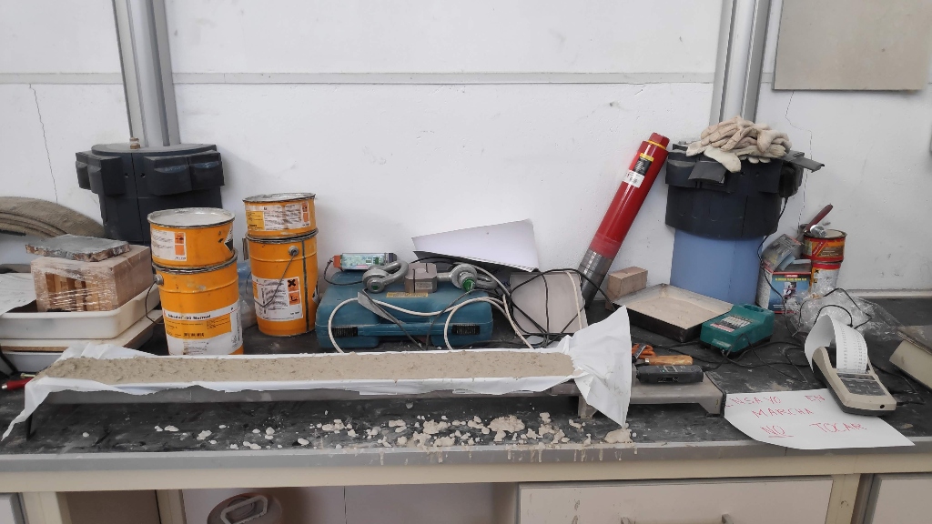 - Pequeño material para ensayos de mortero, hormigones y suelos: densidad en fresco, aire ocluido, retracción de secado, mesa de sacudidas, cono de Abrams, ensayos de hormigón autocompactante (caja en L, embudo en V), resistencia a tracción indirecta, resistencia a flexión.