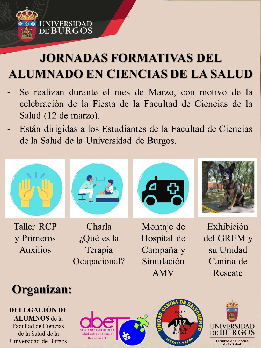 Con motivo de la celebración del Día de la Facultad de Ciencias de la Salud (12 de marzo), la Delegación de Alumnos de la Facultad y la Asociación Burgalesa de Estudiantes de Terapia Ocupacional (ABETO), con el apoyo del Decanato de la Facultad de Ciencias de la Salud y la colaboración del Grupo de Rescate Espeleológico y de Montaña y su Unidad Canina de Rescate, han organizado varias sesiones formativas dirigidas a estudiantes de la Facultad e impartidas por el propio alumnado, con el fin de fortalecer sus capacidades divulgativas y aumentar los conocimientos del resto de compañeros.