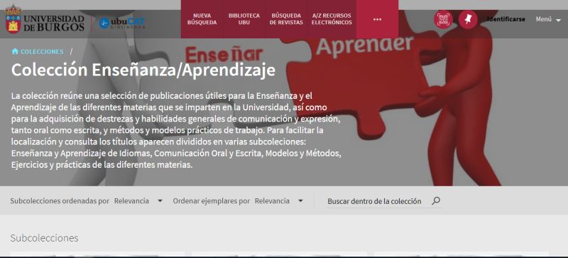 Dentro de las Colecciones destacadas que ha creado la Biblioteca se encuentra la Colección Enseñanza/Aprendizaje que reúne una selección de publicaciones útiles para la enseñanza y el aprendizaje de las diferentes materias que se imparten en la Universidad, así como para la adquisición de destrezas y habilidades generales de comunicación y expresión, tanto oral como escrita, y métodos y modelos prácticos de trabajo.