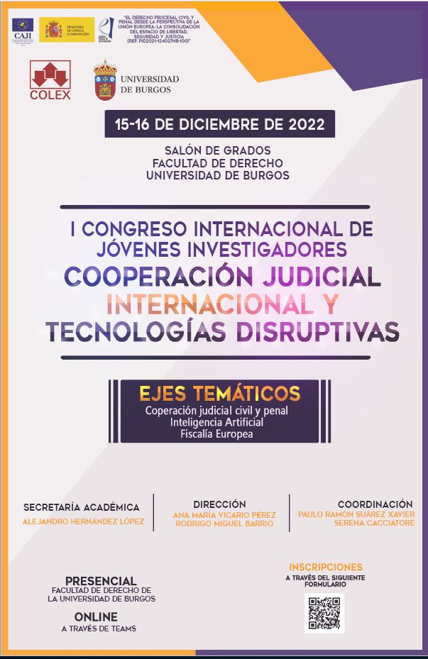 La Facultad de Derecho de la Universidad de Burgos celebrará los próximos días 15 y 16 de diciembre el I Congreso Internacional de Jóvenes Investigadores organizado por miembros del GIR CAJI, en el marco del proyecto de investigación nacional “El Derecho Procesal Civil y Penal desde la Perspectiva de la Unión Europea: la Consolidación del Espacio de Libertad, Seguridad y Justicia (Ref. PID2021-124027NB-I00)”.
