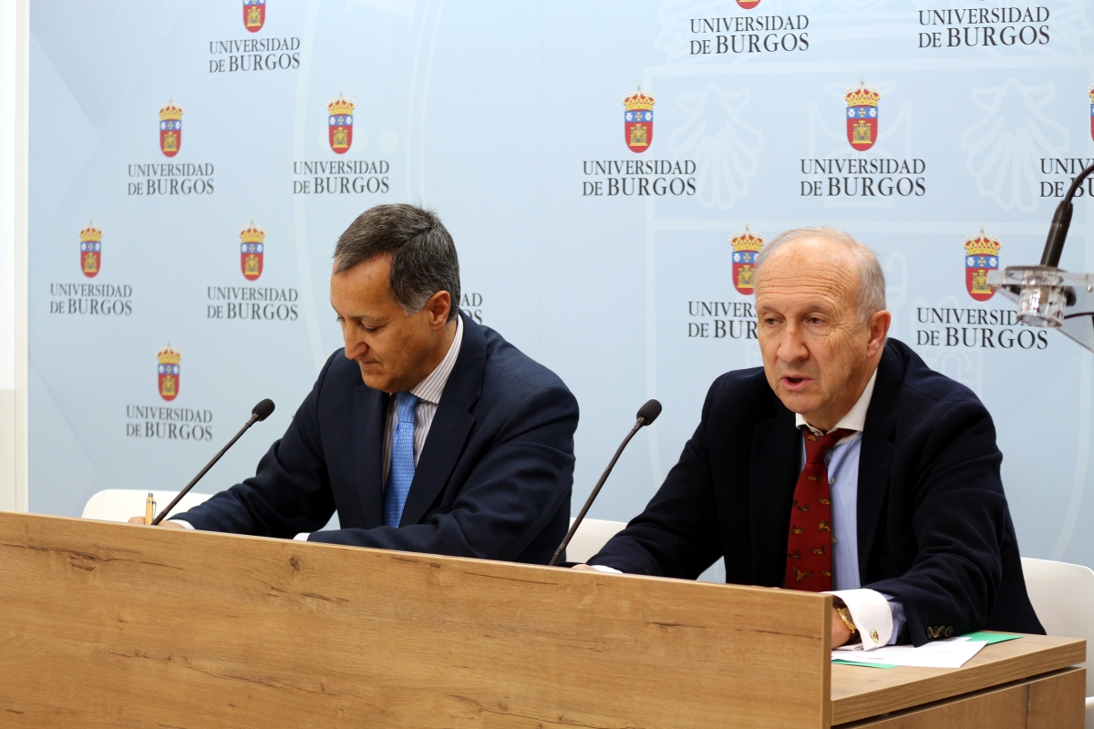 Mateo Díez López, presidente de Rotary Club de Burgos y Manuel Pérez Mateos, rector de la Universidad de Burgos, han suscrito esta mañana un convenio para realizar estudios sobre la poliomielitis en el siglo XXI y para avanzar en la preparación de la memoria de creación de una cátedra.